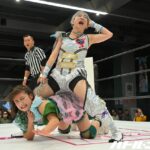 ゆふぁはリバース・スプラッシュ式フットスタンプを連打し、キャメルクラッチ、サーフボード・ストレッチと続ける。そこへ茉莉がスライディング・レッグラリアートを合わせる連携から、茉莉がゆふぁを投げ落とす形での合体ダブルニードロップ。