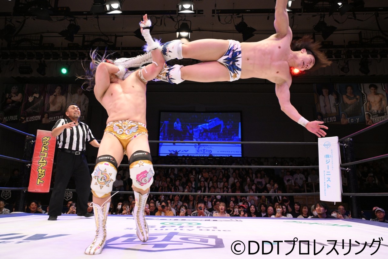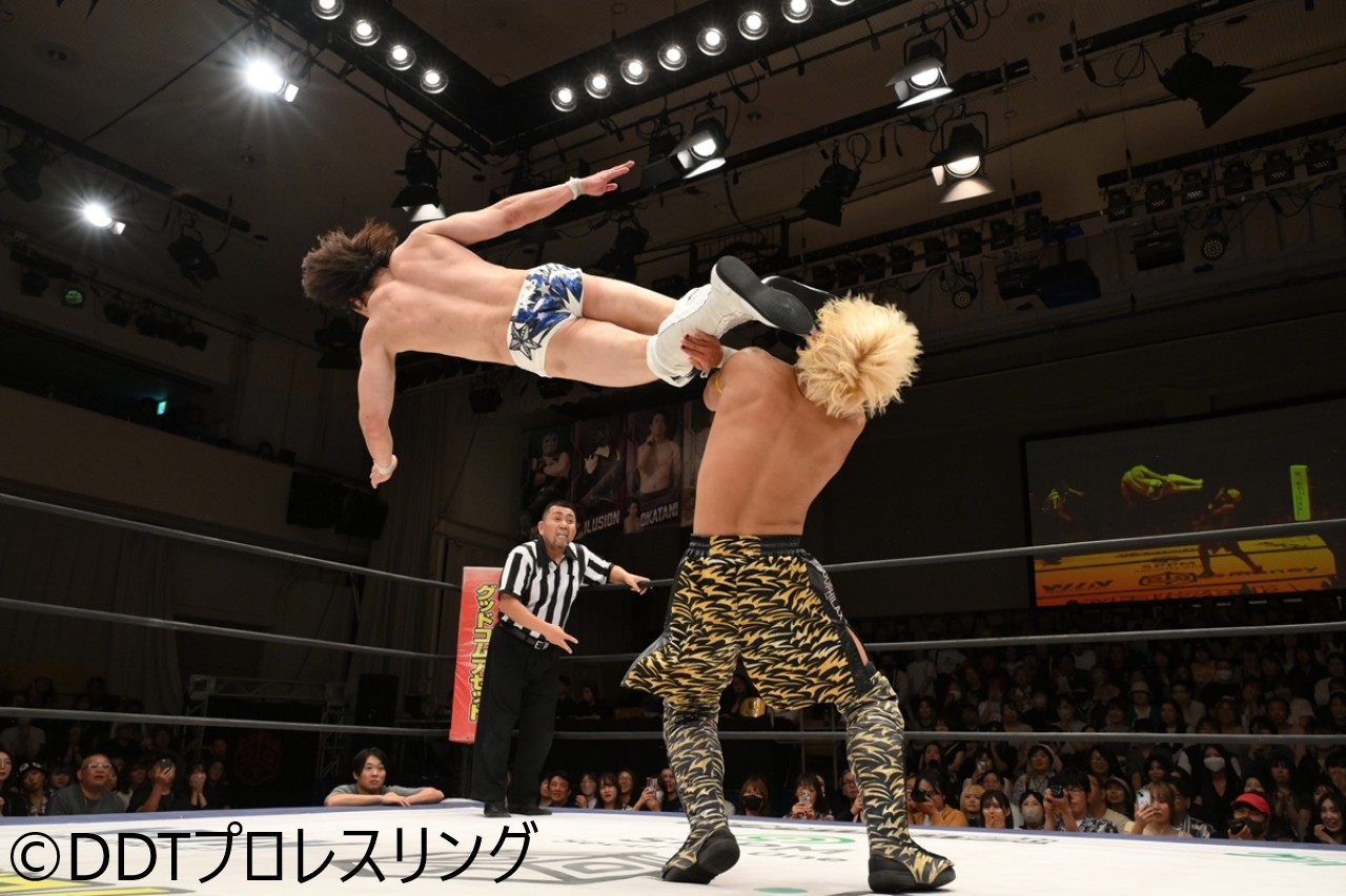 DDTプロレスが9月28日、東京・後楽園ホールで『DRAMATIC INFINITY 2025 ~3時間スペシャル~』を開催した。上野勇希が『いつでもどこでも挑戦権』を行使して、KO-D無差別級王者の平田一喜を破り、1ヵ月ぶりに王座奪還。11・3両国国技館でDDT UNIVERSAL王者・鈴木みのるとダブルタイトル戦を行うことが決まった。