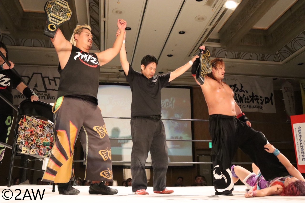 若松大樹が2AW無差別級4度目の防衛に成功!笹村&佐藤は2AWタッグ王者に挑み、王者をギリギリまで追い詰めるも敗北!