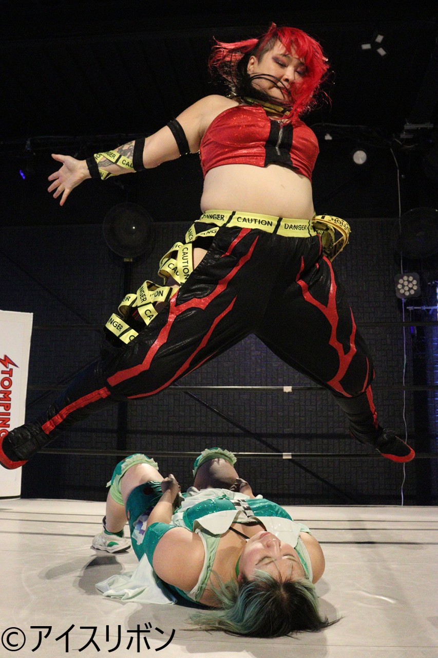 Yappyがドラゴンスリーパー。切り返した緑野がボディスラムからのボディプレスでカバーもカウント2。