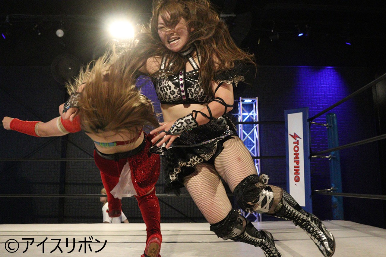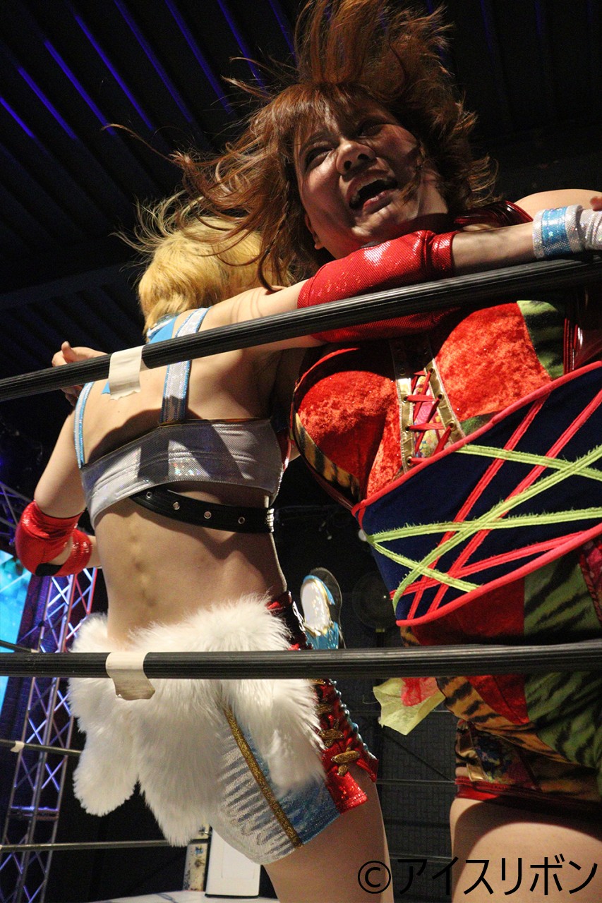きらりがエルボーもいぶきが逆水平チョップで反撃。こらえてエルボーの連打を仕掛けたきらりの腕を取ったいぶきがグランド卍固め。ロープに逃れたきらりにいぶきが飛び込み顔面ウォッシュもきらりがかわし、ロープに足を引っかけていぶきの膝にドロップキック。さらにロープ際のいぶきに低空ドロップキック、回転式ネックブリーカードロップでカバーもカウント2。