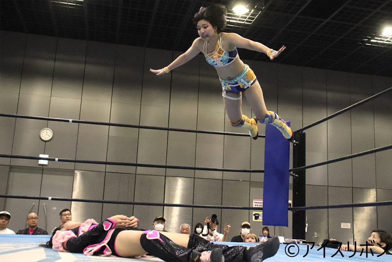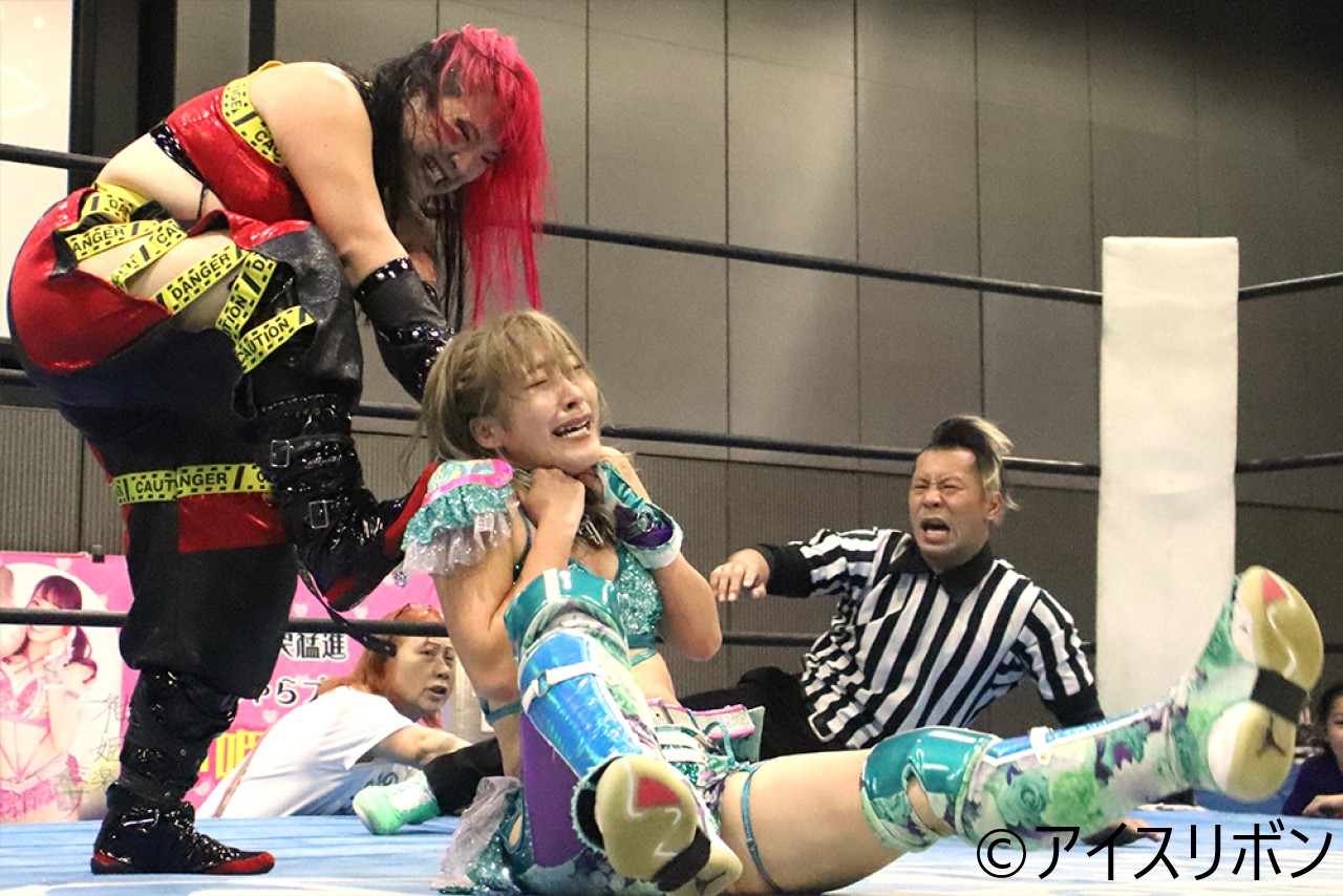 梅咲が旋回式ボディプレスもきらりがかわす。きらりが飛び込んでの回転エビ固めもカウント2。