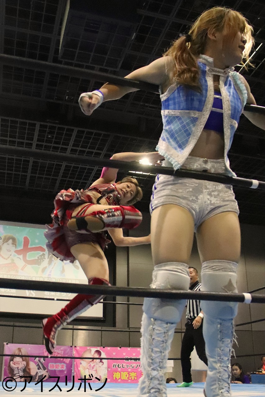 ロープに逃れたもえの膝裏に蹴りを入れたナナミはレッグロックを狙うが、もえが下から蹴りを入れて逃れる。もえが上を取ってのエルボー連打から逆片エビ固め。ナナミがロープに逃れる。エルボーの打ち合いからナナミがもえをコーナーに振っての串刺しボディアタック。ナナミがカバーもカウント2。
