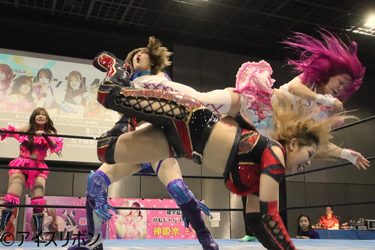 プリンクが勝をロープに振る。勝がクローズラインを狙うが、プリンクがかわす。楓歩が延髄ハイキック、いぶきもハイキックを決め、サンドイッチのダブルキックを狙うが勝がかわして同士討ちに。勝がクローズラインで2人を吹っ飛ばす。神姫楽が入りヴィッキーがダブルニークラッシャー。膝立ちのいぶきに神姫楽が飛び込みラリアット、勝がトラースキック、フットスタンプでカバーもカウント2。