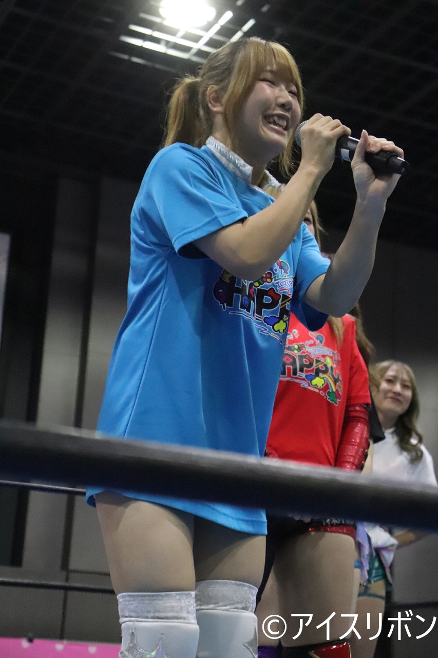いぶきが握手回りをスタートし、握手回り後、再度、マイクを手にし、「プロレスでハッピー!アイスリボーン!」で」大会を締めた。