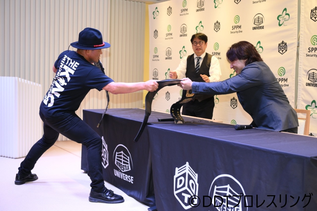 鈴木とのダブルタイトルマッチが決まったことについて、「鈴木さんが持ってるUNIVERSALに、どうやったら挑戦できるんだろうって、この半年ずっと考えていて。僕が呼び出して、タイトルマッチをして負けたから、次に僕が挑戦者に名乗り出るにはどうしたらいいかって思っていて。DDTの一番のベルトを獲って、そのベルト懸ければ挑戦させてくれるんじゃないかと思っていて。須見に勝った後、鈴木さんがこのベルトが欲しいと出て来てくれたとき、ドキドキしました。自分の思ってることを素直に言おうと、鈴木みのるが持ってるUNIVERSALが欲しいと言いました。この半年間、鈴木さんと組んだり、DDTの仲間たちがボコボコにされてる姿を見たりしてきましたけど、なぜか嫌いになることができず。鈴木さんに1度負けた僕が、このダブルタイトルマッチで負けるようなことがあれば、もう今後二度と鈴木さんに挑戦しないと決めてます。でも僕が勝ちますんで、大丈夫です」と語った。