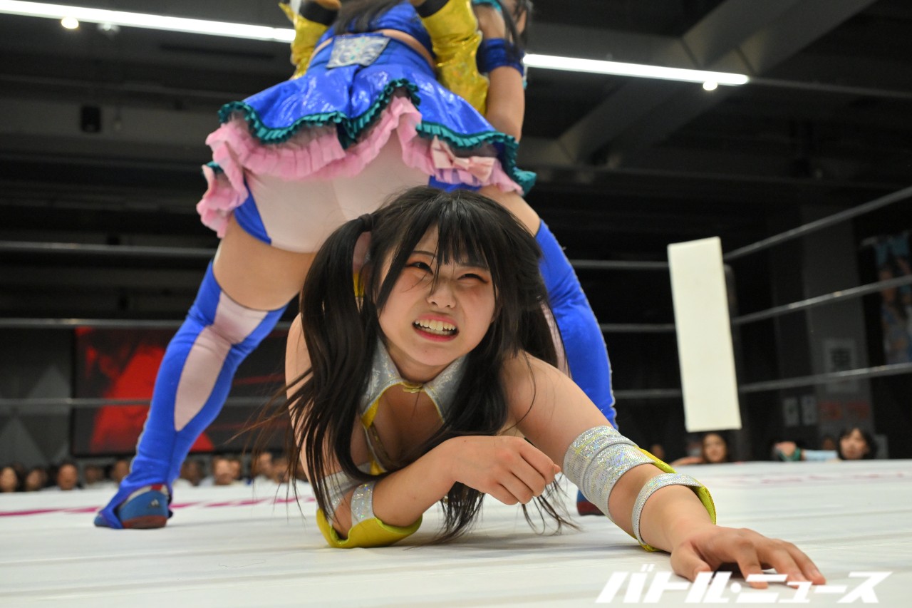 鮮やかな黄色いコスチュームに身を包んで登場したかなは、大先輩を相手にも臆さず元気に突撃。妹加のパワフルなエルボーでぶっ飛ばされても、多恵のサブミッションでガッチリ捕らえられても折れることなく攻めの姿勢を崩さない。