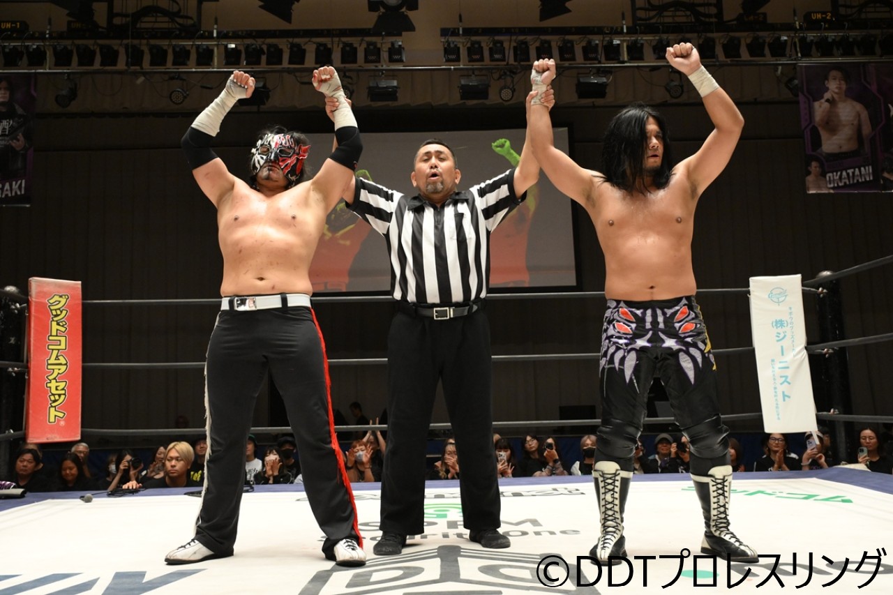 DDTプロレスが10月2日、東京・後楽園ホールで佐々木大輔デビュー20周年記念大会『CHARISMANIAxMANIAxMANIA supported by HEADPHONES PRESIDENT』を開催した。佐々木は記念試合でIWGPジュニア・ヘビー級王者のエル・デスペラードとのタッグで、石川修司&アントーニオ本多に快勝。試合後には自身のバンドでの日本武道館進出を口にした。