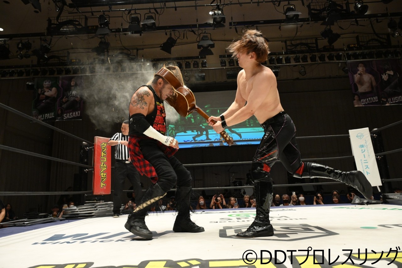 DDTプロレスが10月2日、東京・後楽園ホールで佐々木大輔デビュー20周年記念大会『CHARISMANIAxMANIAxMANIA supported by HEADPHONES PRESIDENT』を開催した。ダムネーションT.Aの岡谷英樹が、“デスマッチのカリスマ”葛西純とのハードコアマッチでの一騎打ちに挑むも惜敗した。
