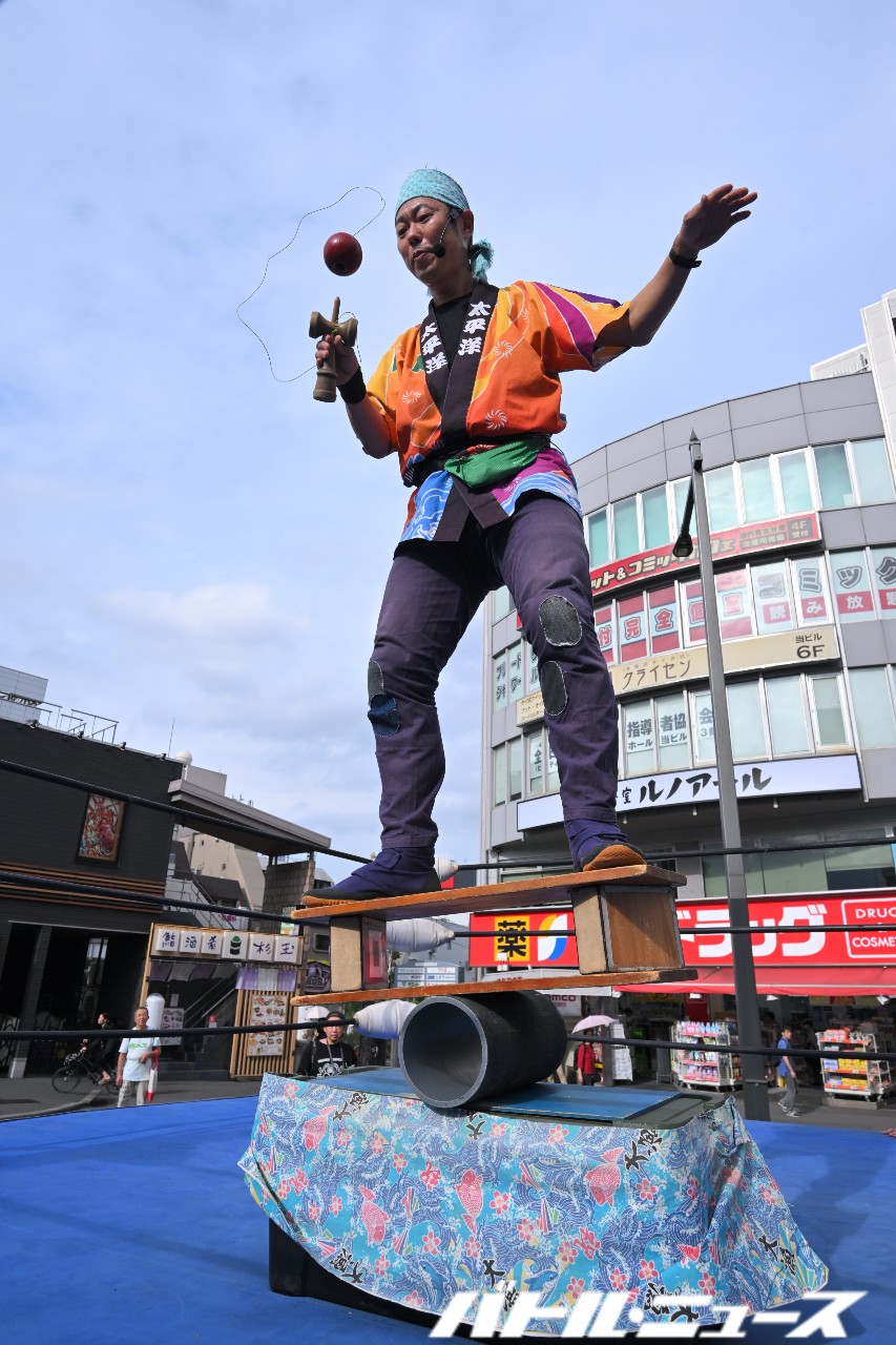 さらに大道芸コーナーでは、和風大道芸を行う太平洋、令和6年度の花形演芸大賞で金賞を受賞したボードビリアンの上の助空五郎、ストレート松浦が登場。太平洋が高難度けん玉やバランス芸、傘回しといった伝統的な芸を披露し、最後にすべてを同時にやってみせると会場は大喝采。空五郎はまったりとしたウクレレの生演奏にのって、ボイパトロンボーンなどを交えて歌い上げる。そして“日本一多忙な大道芸人”ストレート松浦は圧巻のディアボロ(コマ)の技を披露し、そのレベルの高さを見せつけた。