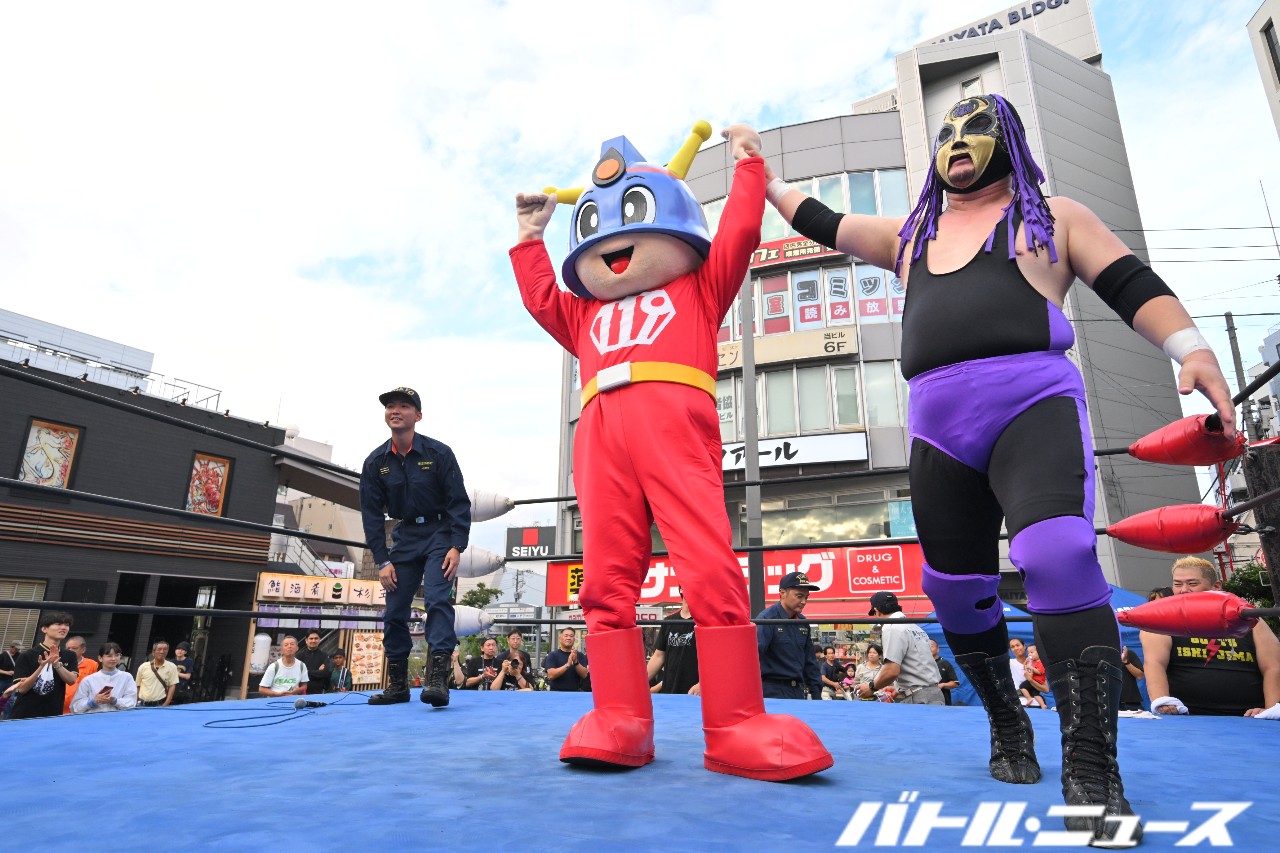 その後は通常のプロレスの試合が3試合行われ、最後に東京消防庁のマスコットキャラクターであるキュータくんと、豊島消防署の小野寺さんがリングに上って防災訓練を行うことに。