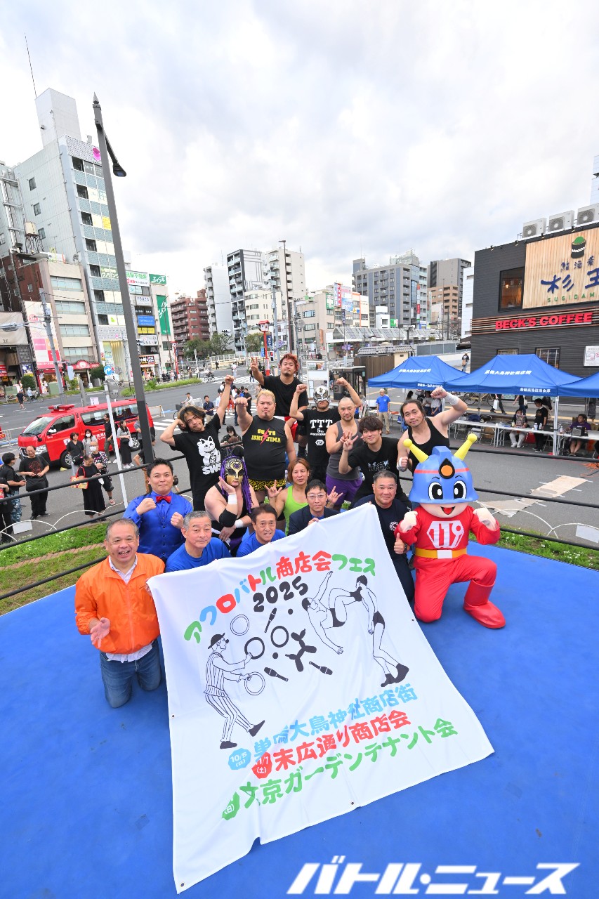 2024年には『演芸とプロレスのエキサイティング笑店会フェスティバル』が開催され、今年は『アクロバトル商店会フェス 2025』の名で開催。今年は巣鴨大鳥神社商店街(豊島区)、末広通り商店会(新宿区)、文京ガーデンテナント会(文京区)の3商店会が参加した。