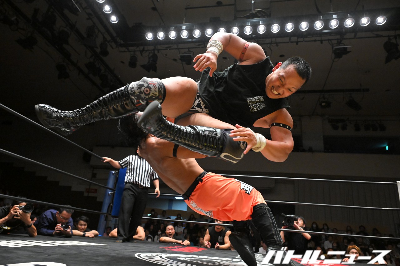 Ben-Kがラリアットで場外に叩き落として必殺のスピアにつなげるボディ攻めを積み重ねていくが、コーナーに上ったところで菊田が妨害し串刺しヒップアタックで頭部をぐちゃりと潰す強烈な一撃で逆転。