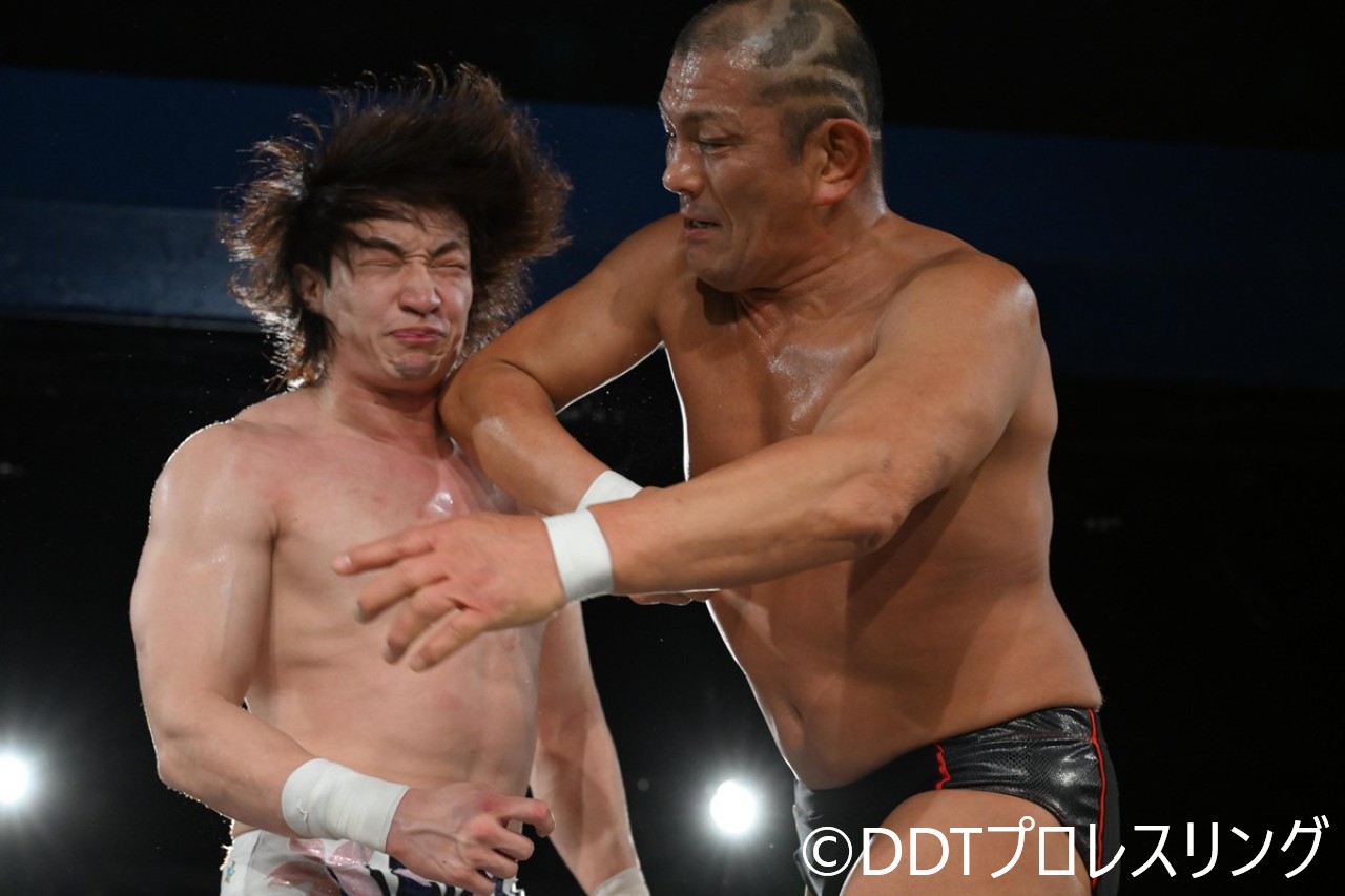 鈴木みのるが上野勇希との初の前哨対決で勝利しDDT3冠宣言!「KO-D6人タッグも両国のダブルタイトル戦も、おまえは俺の前にひれ伏すんだ」
