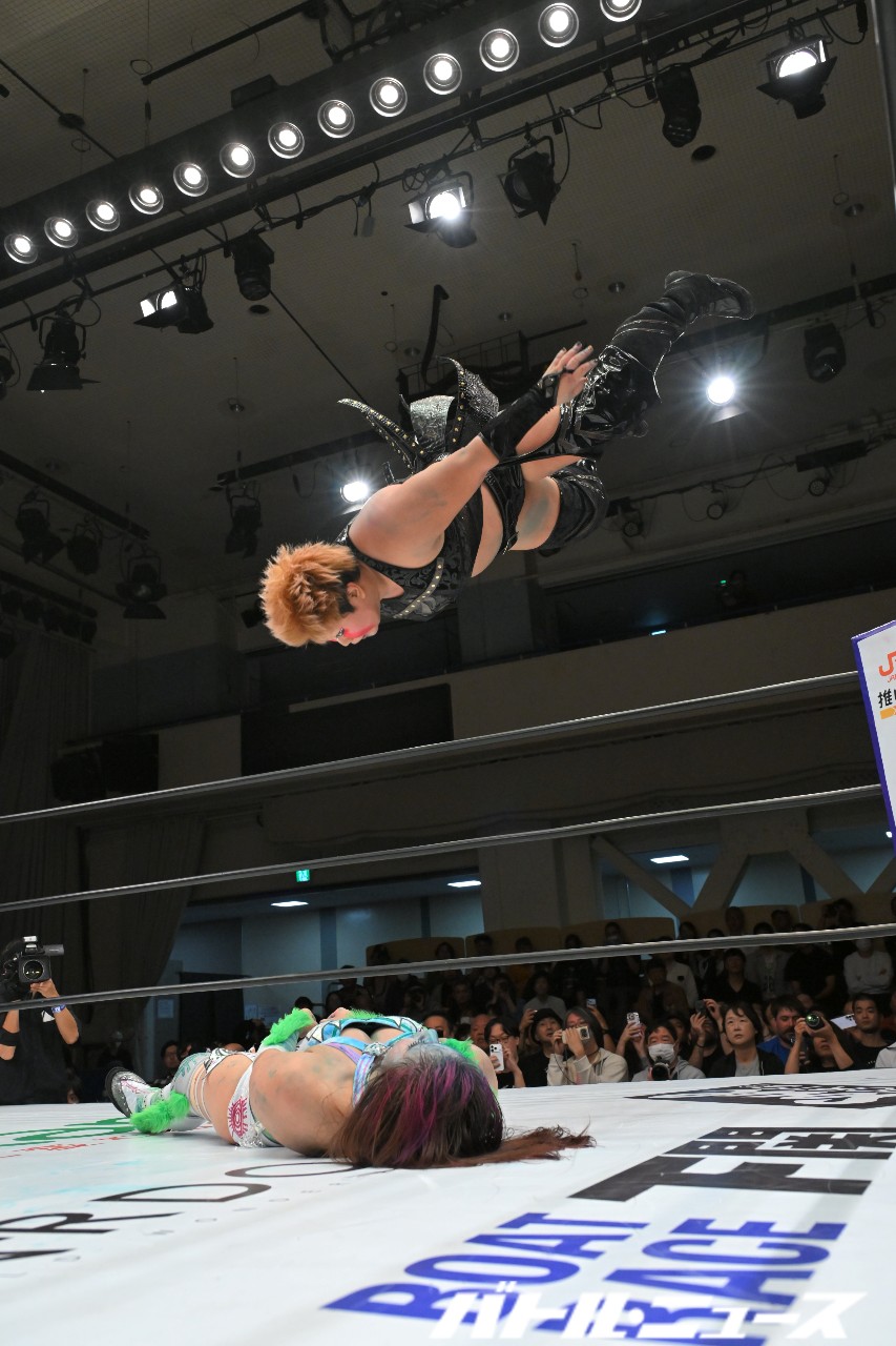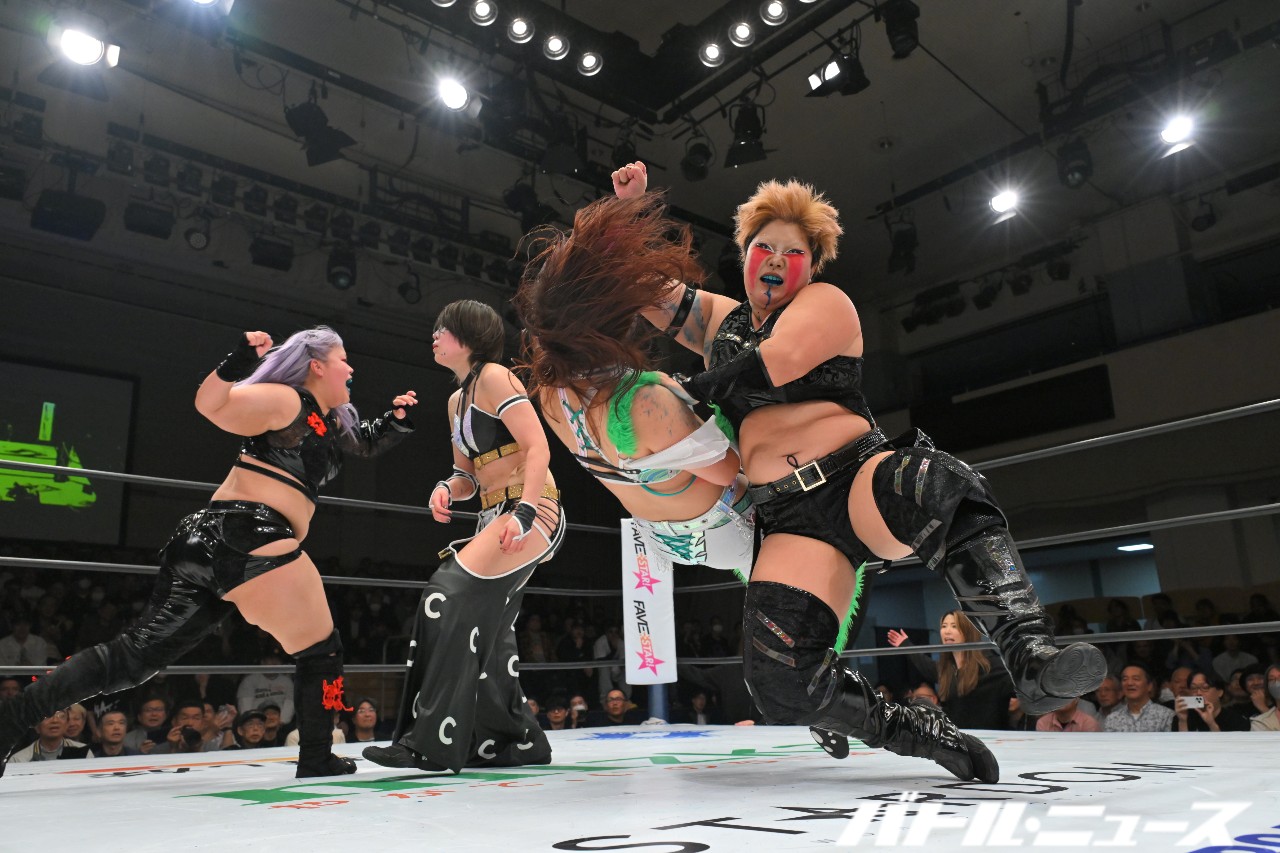 しかし、壮麗が自力で生還すると鬱憤を溜め込んでいたレディが大爆発。2人まとめてコブラツイストで絞り上げたり、コーナーに上ったナツコの顔面をぶち抜くビッグブーツを放ったりと体格を活かしたダイナミックなファイトで躍動。これに鼓舞された壮麗も復活し、高さのあるダブルフラップジャックを決めたり得意のラリアットで琉悪夏をふっ飛ばしたりと大暴れ。