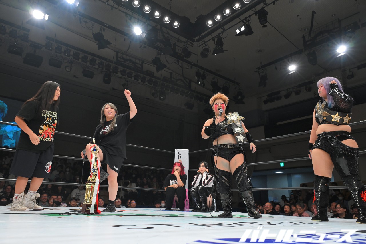 H.A.T.E.の皆で大会を締めようとすると、【Mi Vida Loca】の山下りな&青木いつ希がリングに飛び込んできて挑戦表明。ナツコは「もう締めて帰ろうとしたのに。残業代発生してんだからな?」とぼやきつつ「その残業分、しっかり試合に返してもらうから」と挑戦を快諾。このゴッデス戦がいつ行われるのかはこの日の時点では未定となった。