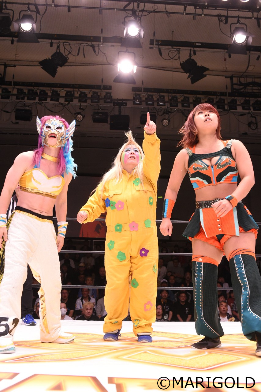 ゴングが鳴るとメガトンが「ガオーッ!」と威嚇して回る中で石川とバードがロックアップからリストの取り合いを展開。石川がバードにショルダータックルを放つが、バードがドロップダウンでかわすとメガトンにヒット。バードがドロップキックで2人まとめて吹き飛ばし、バードの串刺しボディスプラッシュ攻撃もメガトンにヒット。石川とバードのドロップキックが空中で相打ちとなり両者距離を取る。