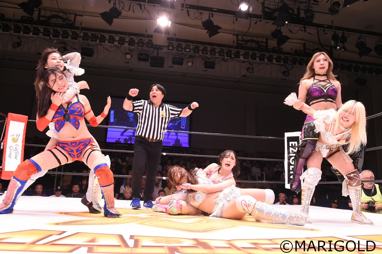 心希は橘にミドルキックを猛連打し、サソリ固め。位置が悪くすぐにブレイクされてしまうが、心希はすぐにロープに振ってラリアットを発射。これをかわした橘がクロスボディで倒し、Selene Floraが連携低空ドロップキック。さらに橘が投げっぱなしフィッシャーマン・バスターからエルボーを連打しバックを取るも、腰を落とした心希がオーバーヘッド・キックで顔面を下から蹴り上げてサムソンクラッチからサソリ固め。これをきずながカットすると、心希が強烈なエルボーでふっとばして排除。橘をコーナーに振るが、橘が三角飛び式ダイビング。クロスボディ。さらに小桃が橘にDDTで追撃し、心希&裕花が交互にサッカーボールキックを連打。心希は裏投げを狙うが、橘が足払いからラ・マヒストラル。これは小桃がギリギリでカット。橘がロープに飛ぶと、心希がカウンターのハイキックを叩き込み、頭頂部からぶっ刺す裏投げで3カウントを奪った。