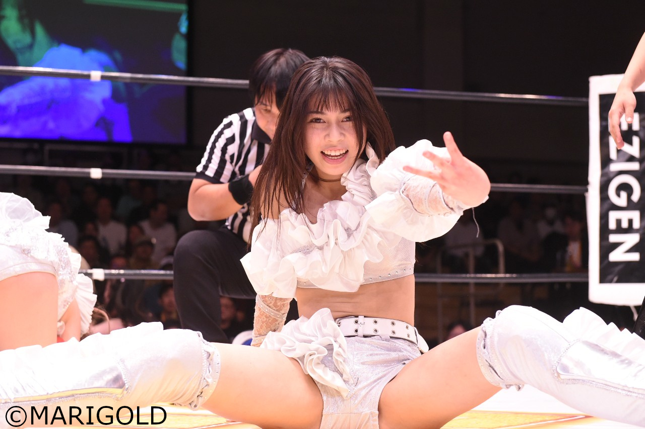 岩谷「今日はマリーゴールドの闘いだったけど、両国大会は…………マリーゴールドの闘いです。(※観衆から笑いが起きる)ちょっと待って(笑)今日は両国大会に向けてみんなで一致団結するために全員で締めたいんですけども、どうですか?!上がれる人は上がってほしいです!……そうだよね、呼びに行かないと全員集まらないよね。(※皆が揃うまで手拍子でつなぐ)すごい!いっぱい来た!ありがとう!あっ、いた!MIRAIさん!……MIRAI“さん”?MIRAIが今日をもってマリーゴールドからいなくなっちゃうんですけど、リングはつながってる。必ずまたこのメンバーで、みんなで闘う日が来ることを祈って、MIRAIさんの新しい門出に、祝って……どうする?(笑)え~、これってさぁ、これってさぁ、でもさあ、MIRAIちゃんがさぁ、最後マイクで締めしたほうがいいよねえ?」