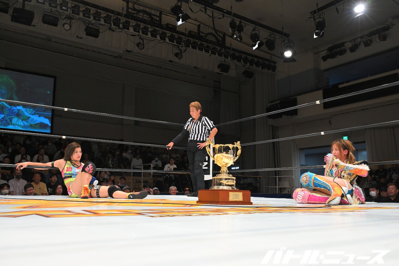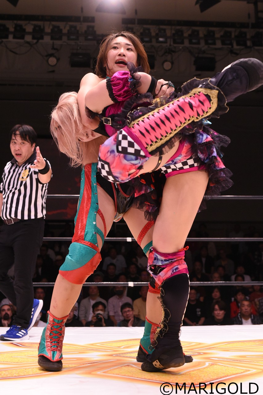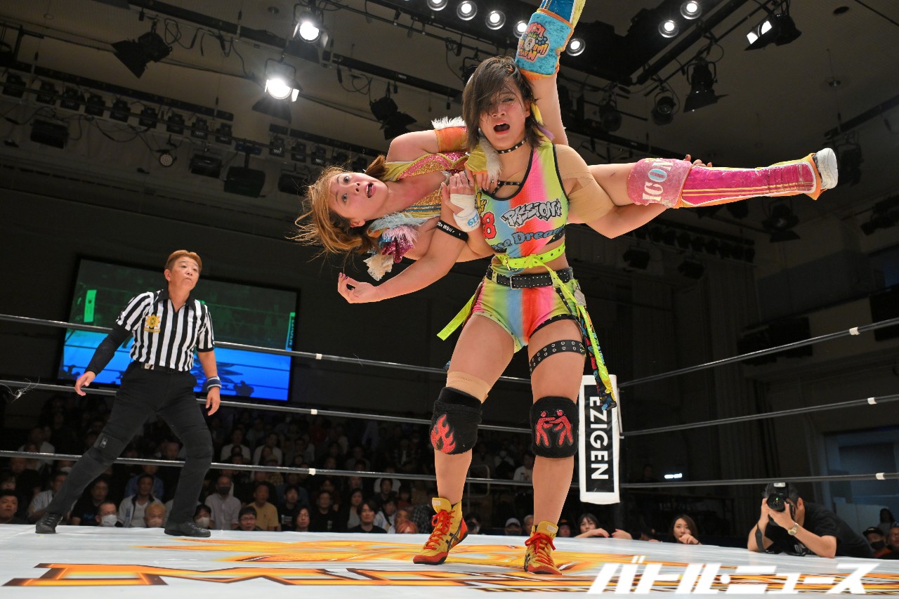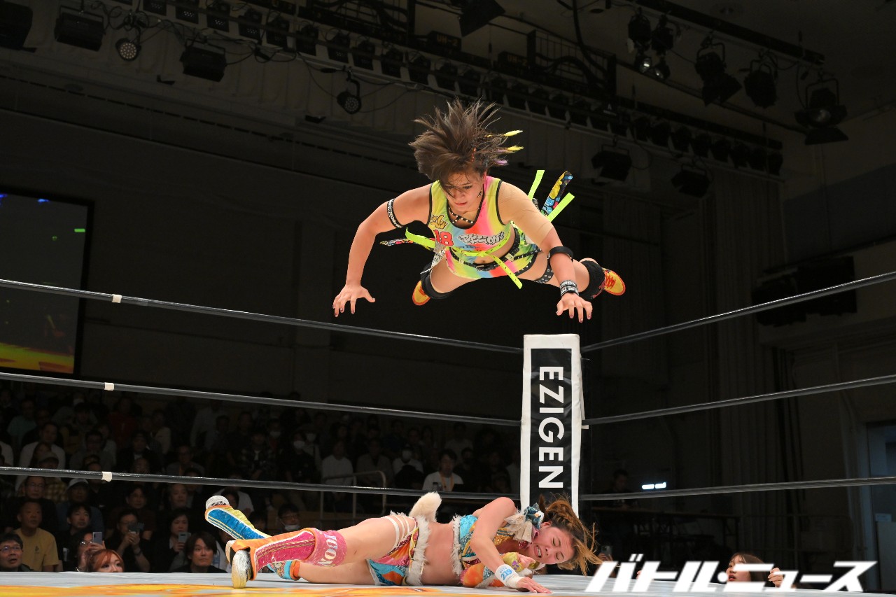 青野は詩美にスタイルズ・クラッシュを狙うが、詩美がショルダースルーで切り返しコウモリ吊り落とし。青野がすぐに起きてバズソーキックからロープに飛んでラリアット。さらにロープに振ってラリアットを狙うが、詩美がカウンターのラリアット。さらに力を溜めてのラリアットで叩き伏せ、トーチャーラック・ボム。さらに詩美がコーナーに上がり、ちゃんよたのブレーンバスターに合わせて飛びつくスーパー・ブレーンバスター。ダメ押しに詩美が青野をハイジャック・ボムで叩きつけて3カウントを奪った。