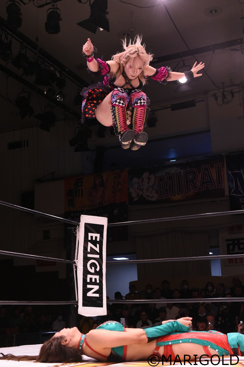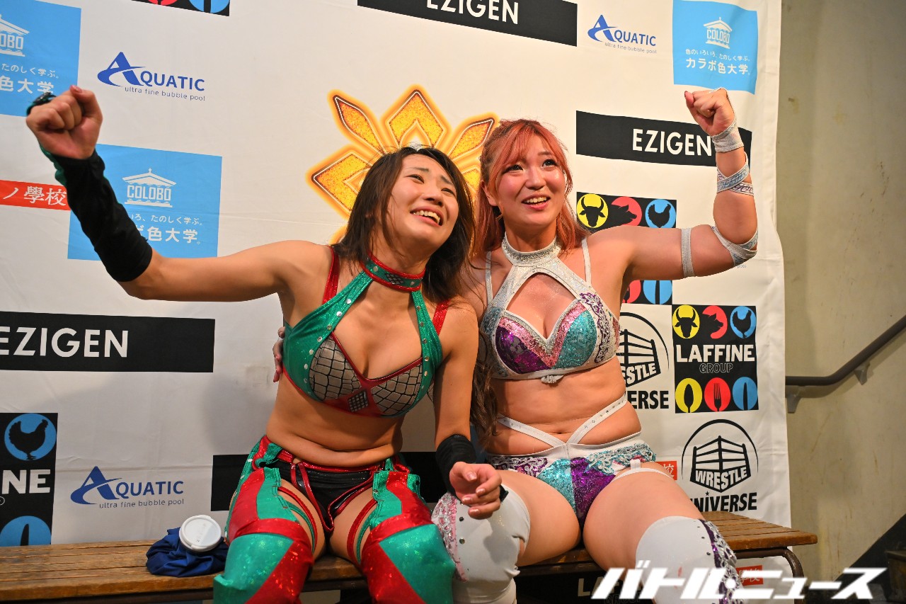 MIRAIが桜井を呼び込み、野崎&CHIAKIをまとめて合体STO。さらに桜井がCHIAKIにシャイニング・ケンカキックを叩き込み、桜井のバックドロップにMIRAIがラリアットを合わせる合体攻撃で3カウントを奪った。