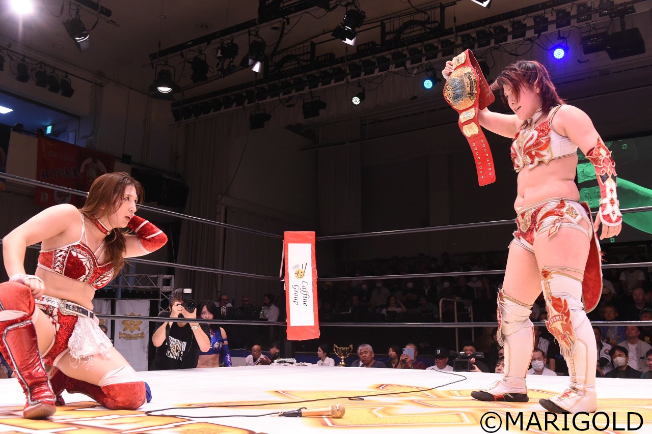 MIRAI「退団……あっという間にこの日を迎えてしまいました。あんまり時間なかったんだけど、こうやって闘ってみたら実感が湧いて、色んな経験してきたことが頭に浮かんでくるなって思います。でもこれだけ言えるのは、最後は桜井麻衣の隣で闘えて本当に良かった。桜井麻衣とは今まで一緒にやってきたけど、隣りにいたり、離れたり、また隣になったり、近づいたり離れたりしてきたけど、今までの離れるとは違う離れるになっちゃうなと思うけど、ちゃんとお互いがお互い、自分が目指すプロレス像っていうのがしっかりあるから、もっともっとそれに近づいた状態で、もっともっと大きくなった状態でまた一緒のリングに立ちたいと思ってます。(※MIRAIと桜井が握手を交わし、桜井が先に退席)本当に色々考えたら短かったけど、マリーゴールドで経験できたことは自分のプロレス人生の中ですごく大きいし、いろんなことを小川さんにも叶えていただいたし、本当に感謝しか無いです。自分は人生は冒険だと思っているので、これからどうなるかわからないけど、自分自身を信じて、自分の心の中にあるコンパスを信じて、その方向に自分らしくまっすぐに進んでいきたいと思います。本当に皆さんありがとうございました!また魂込めてお会いしましょう!」