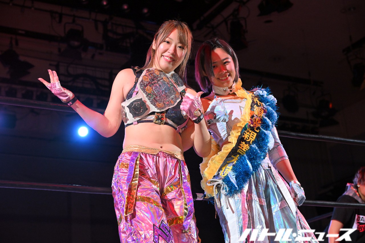 ちゃんよた「今日初めて詩美さんとタッグを組ませていただきました。そして詩美さんが最後ガッチリ獲ってくれました。本当に本当に心強かったです。近くでこの赤いベルトの前哨戦を近くで感じられて、すごくすごく自分もこれからやってやるぞという気持ちになりました。今日はありがとうございました」
