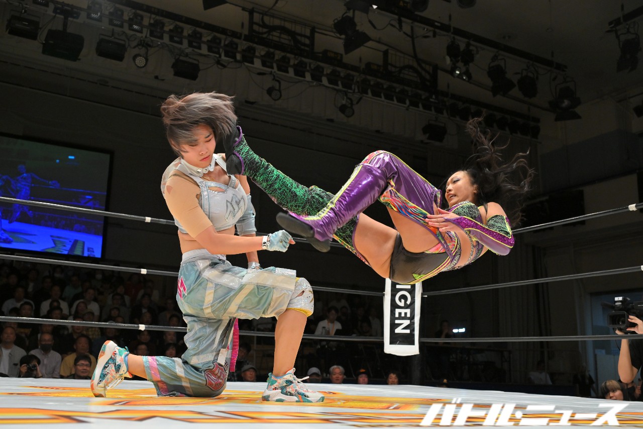 きずなと心希の対面でゴング。いきなりエルボー合戦から始まり、心希が気迫の連打からロープに飛ぶもきずながカウンターのミドルキック。さらにハイキックを放つも、心希がかわしてクリーンブレイク。両者タッチ。