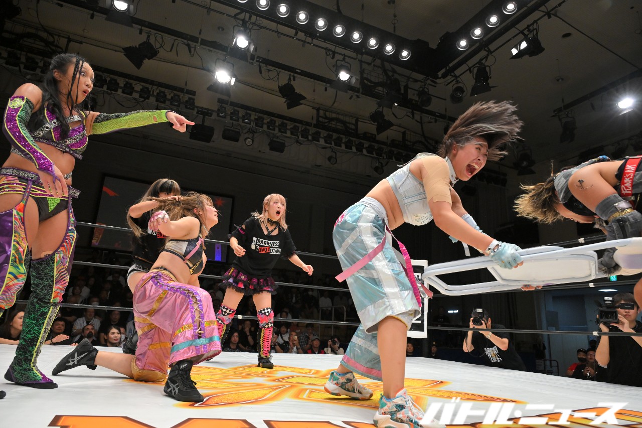 リング上が無法地帯となる中、松井&レアが上がってきて桜井を袋叩きに。CHIAKIがアルゼンチン・バックブリーカーで担いだところに野崎がトラースキックを入れ、そのままCHIAKIがムーン・ウルフ。再びCHIAKIがイスを振りかぶるが、MIRAIがカットしてCHIAKIにイスで一撃。さらに野崎にショルダータックル。松井&レアにそれぞれラリアット。野崎&CHIAKIがMIRAIをロープに振るが、MIRAIがダブルラリアットでなぎ倒す。