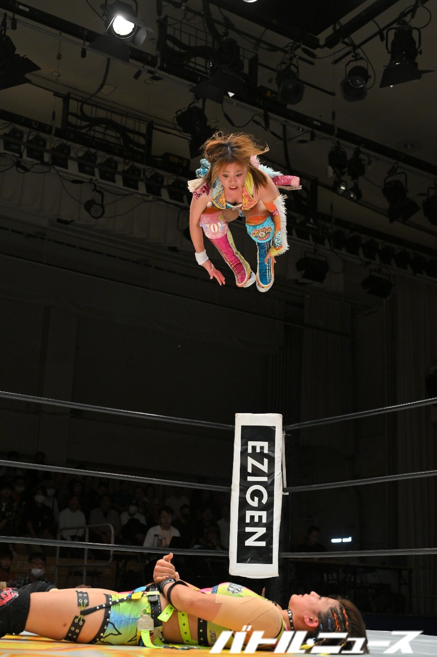 詩美は青野にドロップキックから串刺しバックエルボー。さらにショルダータックルを放つも、青野が正面から迎撃し互角のぶつかり合いを展開。これを制した詩美がアルゼンチン・バックブリーカーも、青野がすぐに着地しローキック連打。詩美はこれをキャッチして強烈なエルボーを叩き込み、アルゼンチン・バックブリーカーからのバックフリップ。詩美はジャーマンを狙うが、青野がバックを取り返したところに絵里奈がスタンド式シャイニング・ウィザード。さらに青野がハイキックからダブルアーム・スープレックスで叩きつけ、コーナーに上っていく。ちゃんよたもコーナーに上って妨害し、詩美とちゃんよたがダブルの雪崩式ブレーンバスターという荒業を披露。