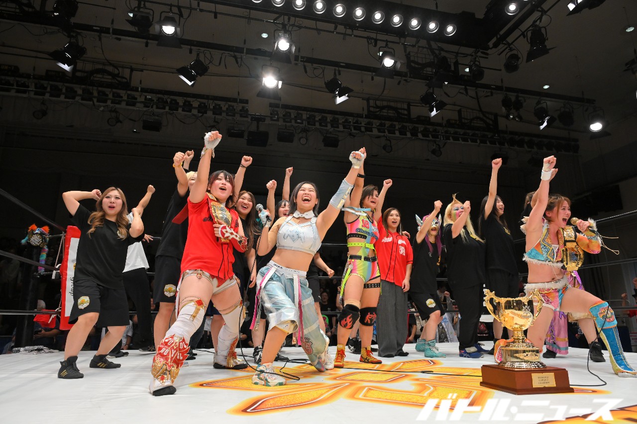 桜井「MIRAIのマリーゴールドラストマッチは隣に立たせていただいて。本当にこの4年間あっという間だったなって。すごく……言葉ではまとめきれないんですけど、楽しいときもつらいときも、練習とか、諦めないで逃げ出さずにやってこれて、切磋琢磨してこれて、こんな……私、そういう同期がいなくて。MIRAIは1個先輩なんですけど、そういう仲間がいたから今の私があるなって本当に思ってる。だからMIRAIと出会えたことが今の私につながってるし、もちろんこうやってマリーゴールドに来て立場が変わって、お互いいろんなことを考えて、上手くいってきたことだけじゃなくて、意見がぶつかったりしたこともある。でもそれはお互いプロレスのことをまっすぐ考えててプロレス愛があるからのことだなって思ってる。これからはそれぞれの道を行くと思うんだけど、必ず絶対自分の信じた道で絶対に夢を掴んで、またお互いリングで会いましょう。ありがとう!」