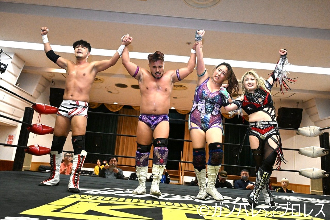 大会3日前のこの日、まなせとYuuRIがタッグを組み、今成&冨永真一郎と対戦。ガンジョ勢は冨永を好連係で攻め立てた。今成組も合体攻撃でYuuRIを攻める。YuuRIが今成にエルボー、ショルダータックル連発。さらにYuuRIは619で2人まとめて吹っ飛ばした。まなせが男子顔負けのパワフルなラリアットを今成に叩き込むもカウントは2。YuuRIのミサイルキックがまなせに誤爆。冨永がYuuRI、まなせに立て続けてJKを叩き込むと、今成がラリアットでまなせにトドメを刺した。ガンジョ勢は試合には敗れたものの、男子に負けない気迫を見せつけた。