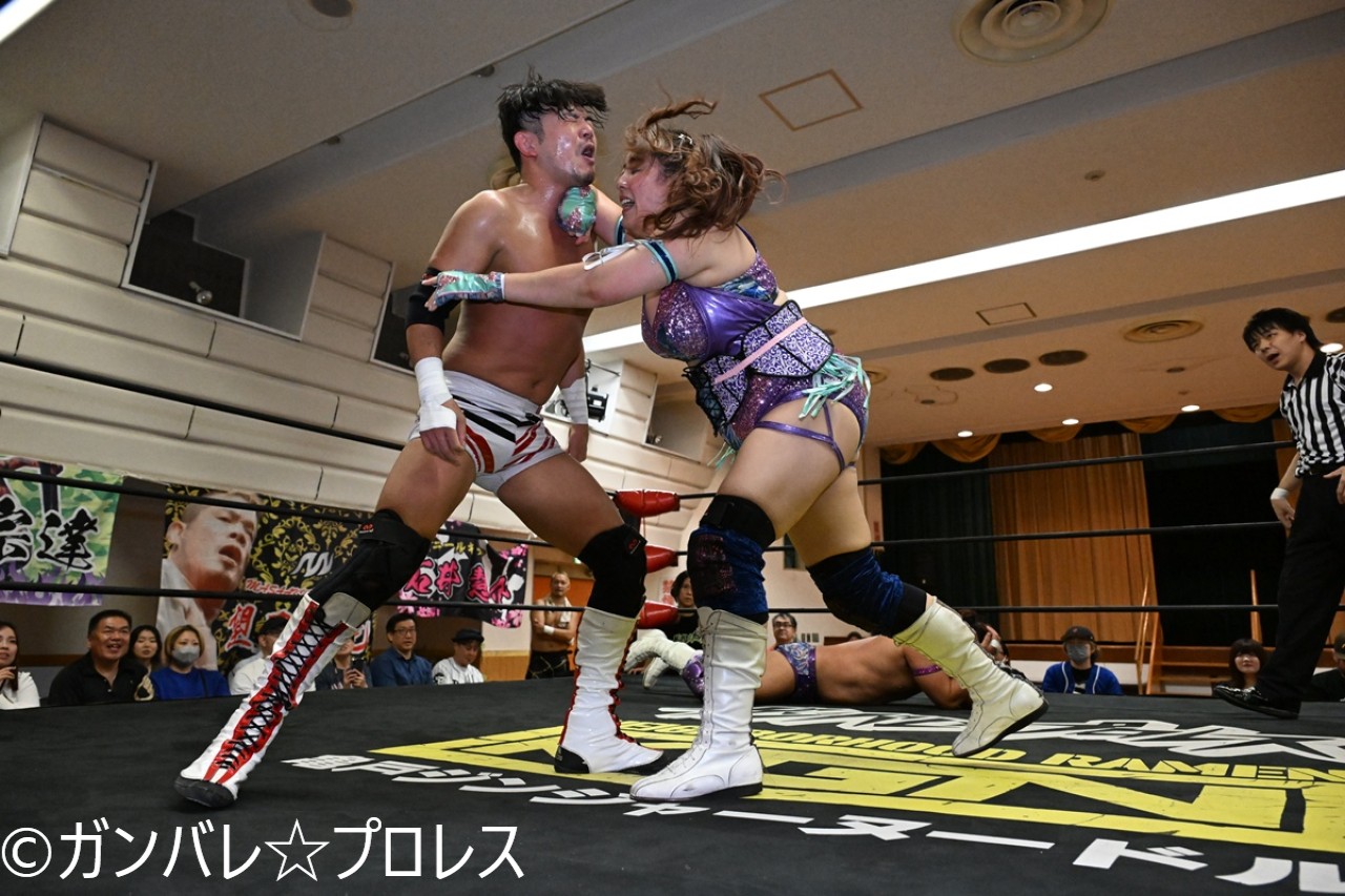 8・11高島平で開戦した両団体の対抗戦は戦いを重ねるごとにヒートアップ。8・26後楽園ではまなせと佐々木貴との遺恨が勃発。9・15高島平では大会終了後のガンバレ☆集会で、YuuRIが「女子の枠にはまりたくない。だからガンプロに入ってんだ!」と叫び、男女の枠なく、10・16新木場での全面対抗戦が緊急決定した。同対抗戦は全6試合が組まれ、まなせは今成夢人と組み、佐々木貴&杉浦透と対戦。YuuRIは石井慧介、和田拓也とのトリオで、マンモス佐々木、正岡大介 吹本賢児組と激突する。