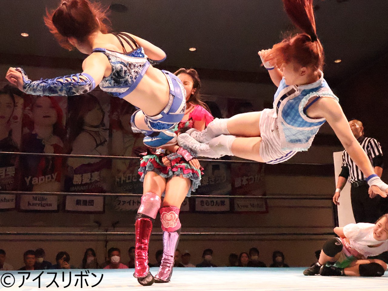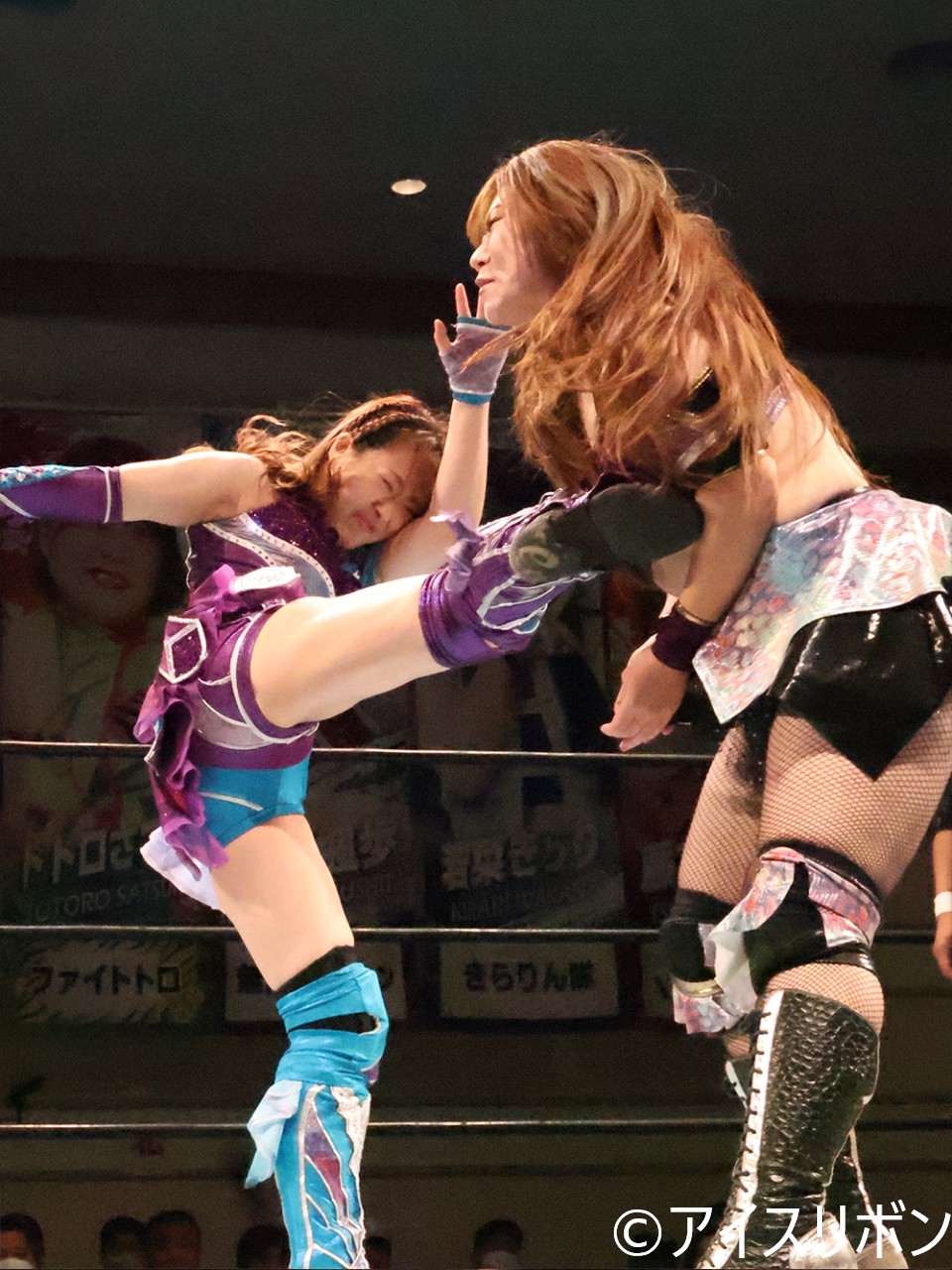 きらミクがダブルドロップキックで美蘭を吹っ飛ばし、きらりがりこにダイビングフットスタンプもきらりがかわす。りこが丸め込み連発もきらりがキックアウト。りこが足4の字固め。ミクがカット。美蘭が入り、りこがきらりに、美蘭がミクに同時クリスト。ロープに逃れたきらりに美蘭とりこがダブルドロップキック。りこがカバーもカウント2。