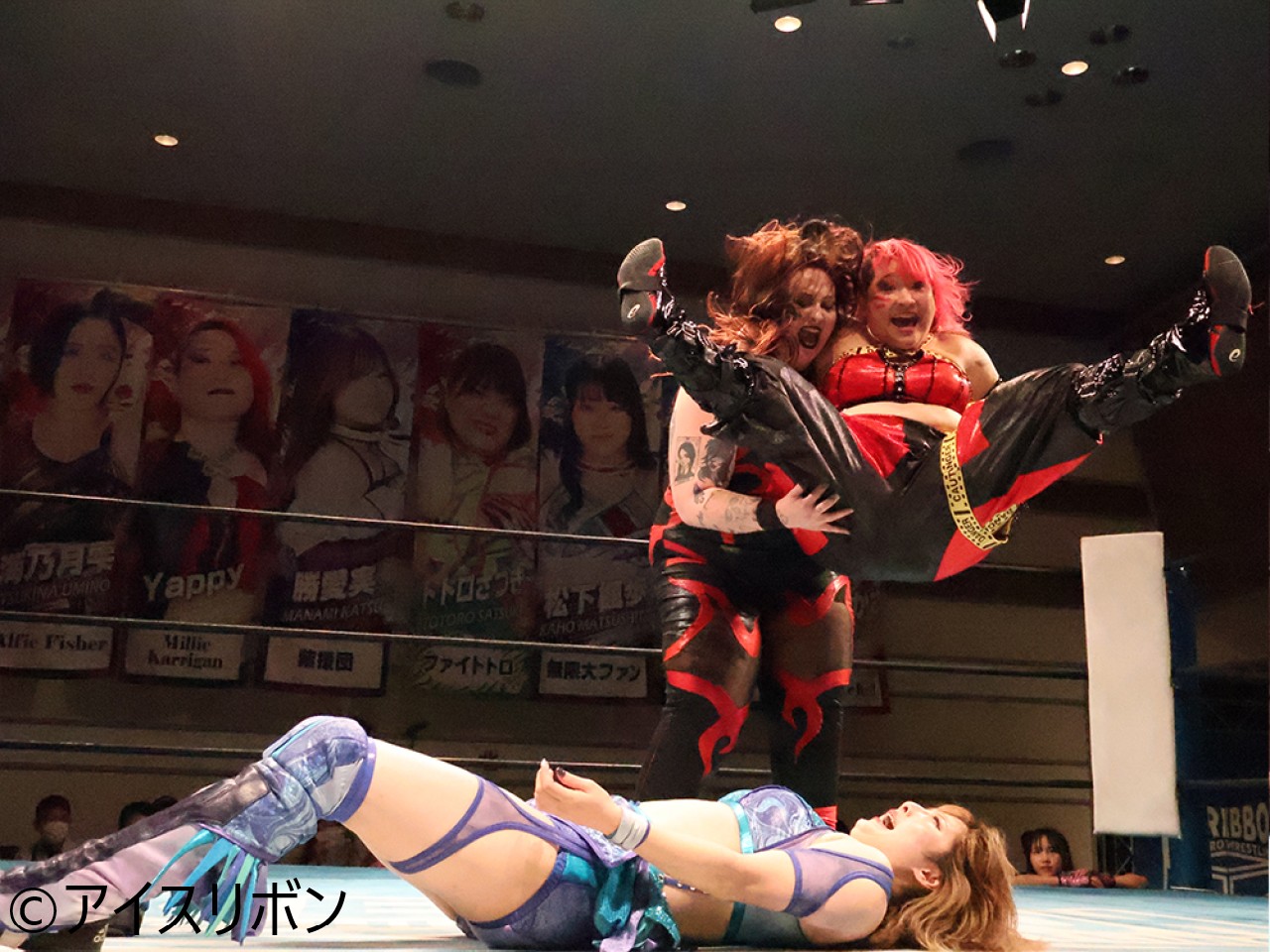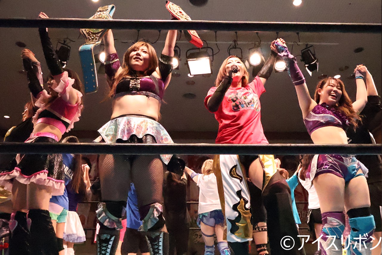 ※握手周りのあと、再度、楓歩がマイクを手にするも、最後の締めは復帰を果たした海乃に譲り、海乃が「プロレスでハッピー!アイスリボーン!」で横浜リボンを締めた。