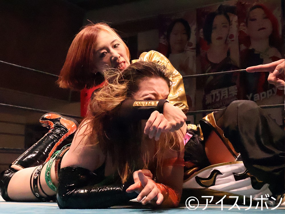 Yappyがドラゴンスリーパー。ロープに逃れた愛梨紗に飛び込み開脚ヒップアタック、ギロチンドロップでカバーもカウント2。