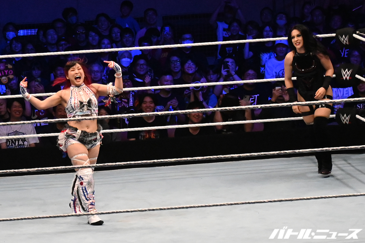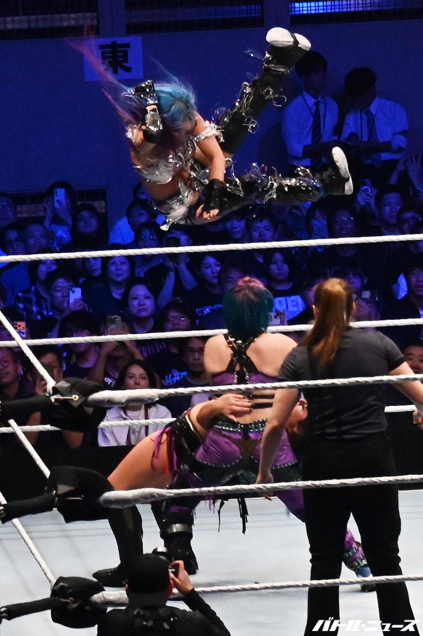 イヨ・スカイが日本でWWE女子世界王座に挑戦も戴冠ならず!ASUKA&カイリ・セインは勝利し喜びのハグ!