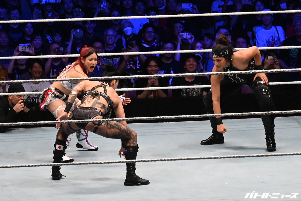 次の試合ではライラ・ヴァルキュリア&ベイリーvsASUKA&カイリ・セインが行われ、身体能力の高さで攻めるベイリーをASUKAがいなし、カブキ・ウォリアーズが連携攻撃で攻め立てると最後は合体インセインエルボーをライラに投下し3カウントを奪取。日本公演での勝利に抱き合って喜びをあらわにした。
