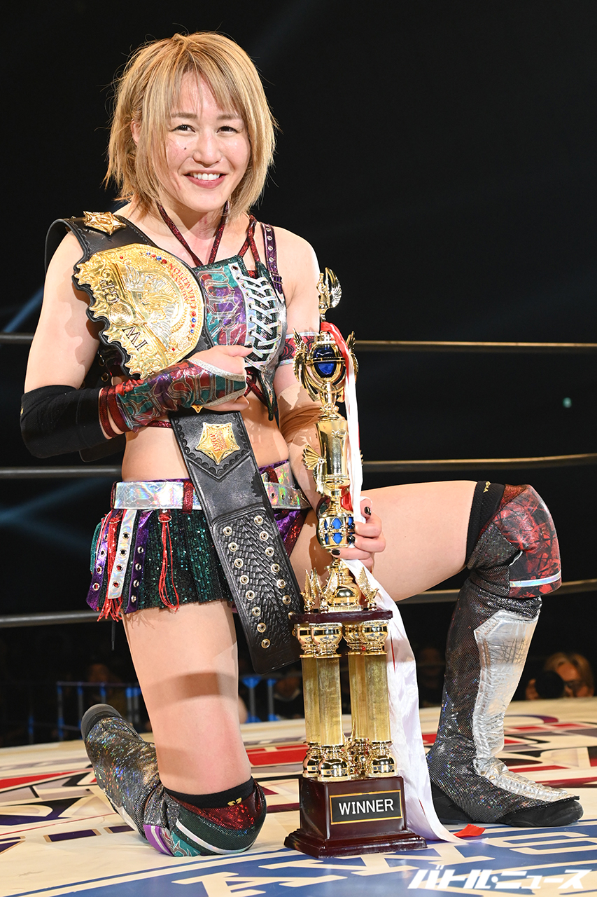 朱里「今年の6月にSareeeに負けてベルトを落として、この機会にMRIを撮ってみようと思って病院に行ったら急遽手術になりました。治療のためIWGPを再度挑戦しに行けなくなってしまいすごく悔しく思ってました。でも『スーパーサイヤ人になって戻ってくる』って約束した通り、めっちゃ回復させて戻ってきたっていう感じです。全然伸びなかった腕が伸びるし曲げれるしで、17年やってるのでダメージの蓄積はありますけどコンディションはばっちりです!」