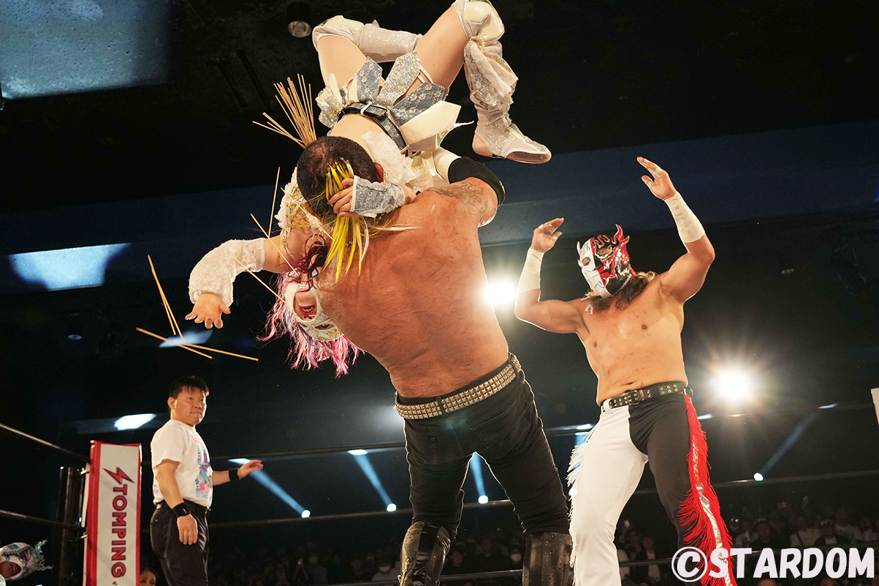 試合序盤ではDK&デスペで捕らえた京子の背中にSLKが飛び乗り「キッちゃんファミリー」とポーズを決めるが、逃れた京子がSLK、DK、デスペの顔面に尻を押し付けて圧殺。SLKのマスクに手をかけると、鷹木がDK、葛西がデスペのマスクに手をかけ本当にマスクを剥いでしまったため会場は騒然に。