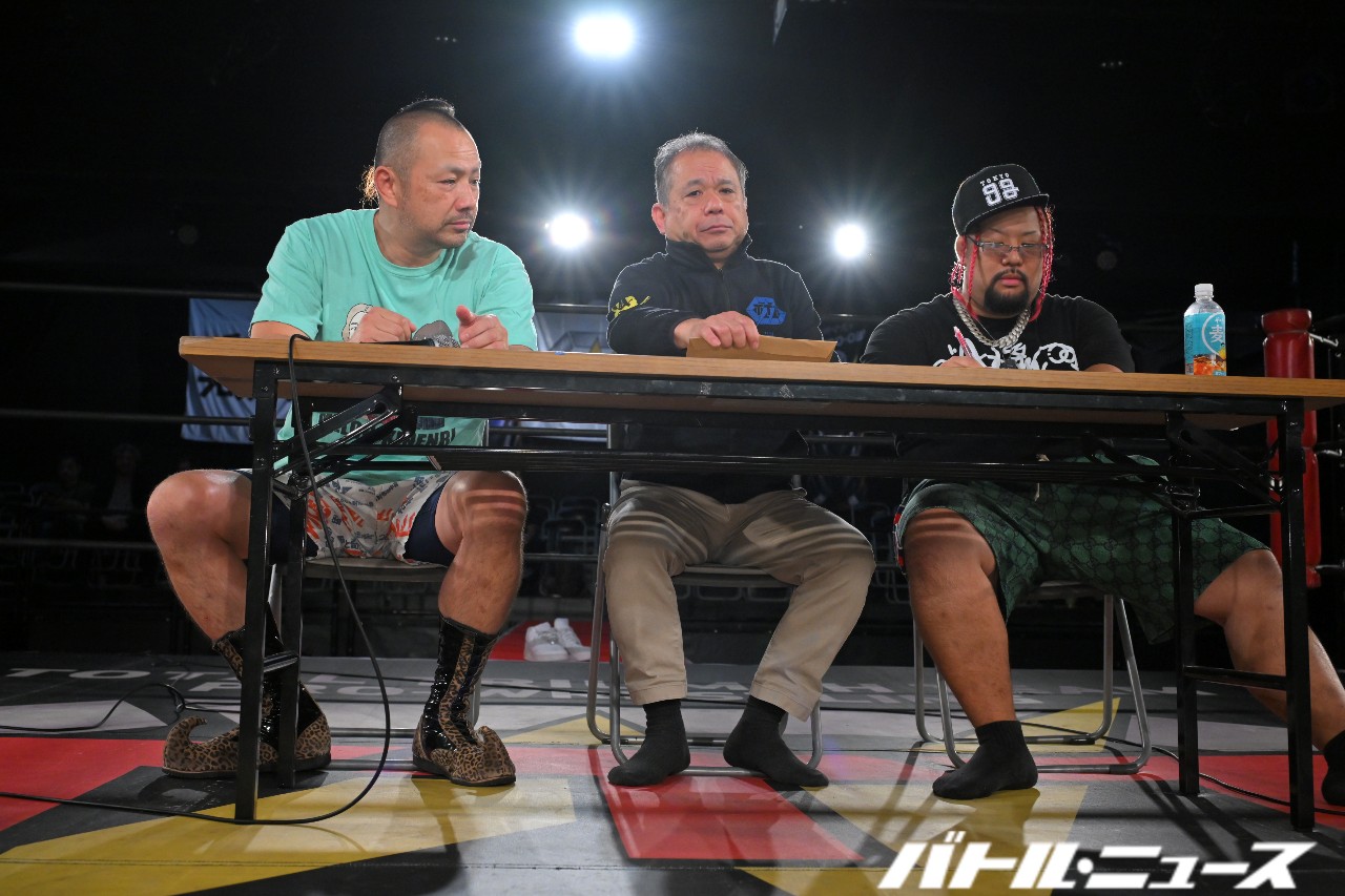 ゴキブリ商会の定アキラ、元祖ゴキブリ商会の藤原秀旺、そして我らが石川会長の3人が出席する公開記者会見がリング上で実施。