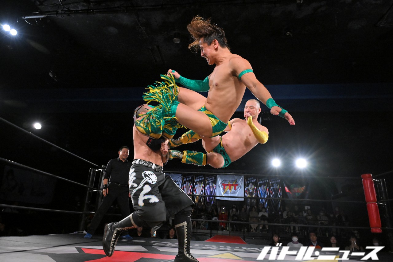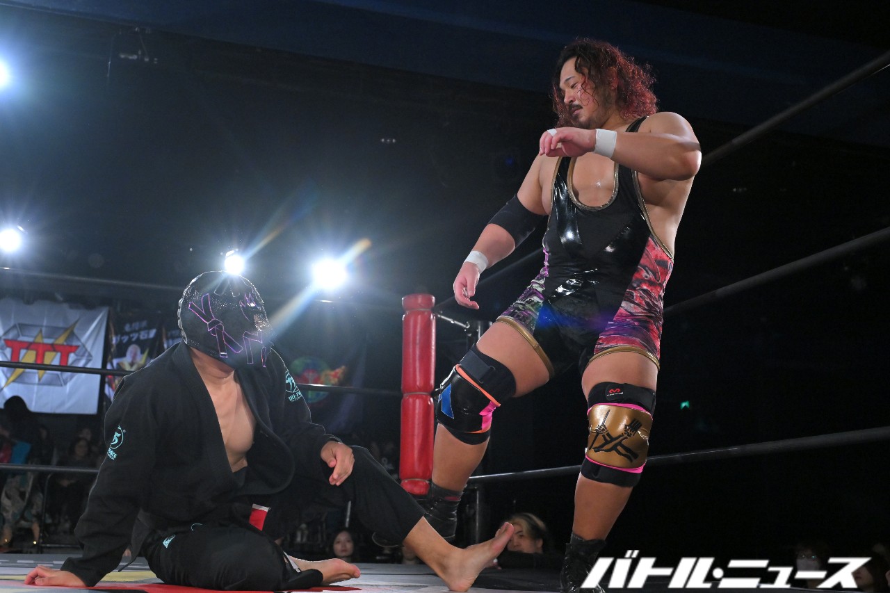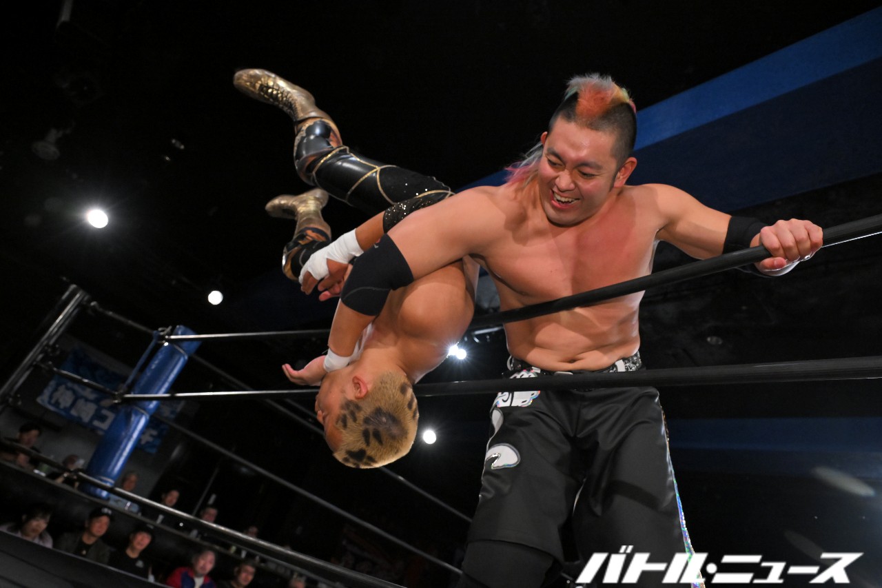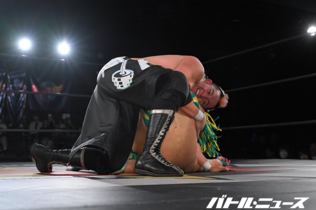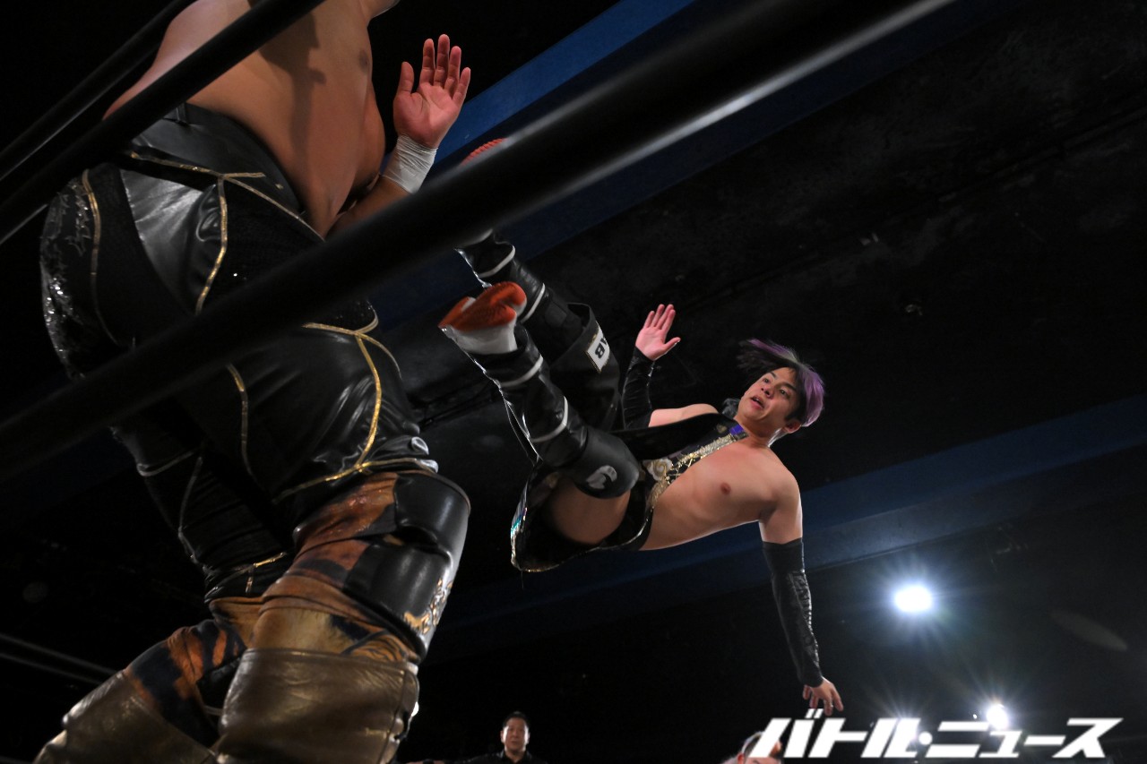 綾斗が「なにされてんねん、これ……」と困惑する中、滝澤が振り払ってバイシクル・キック。ロープに飛ぶが、攻撃をかわされてエプロン上で揉み合っていた秀旺&藤田に激突。ふらついたところを綾斗が変形サムソンクラッチで捕らえて3カウントを奪った。