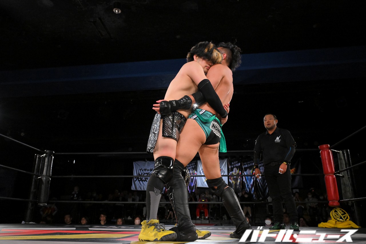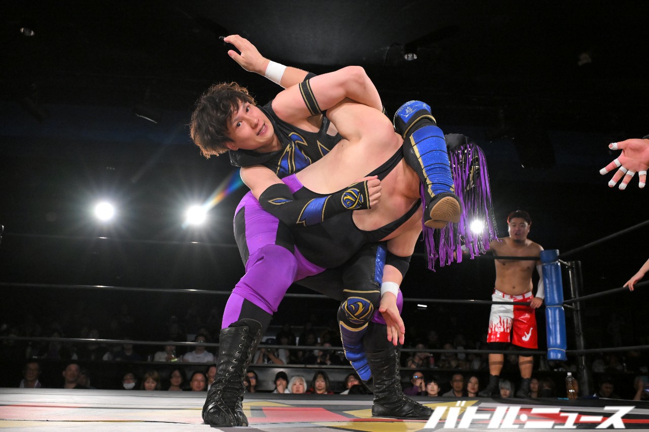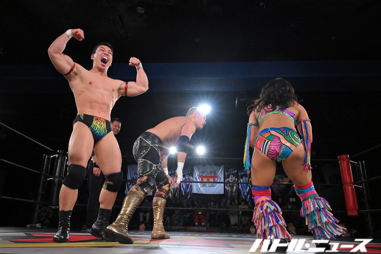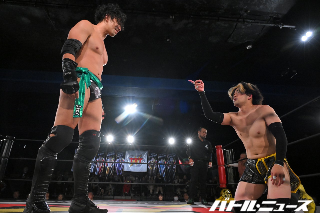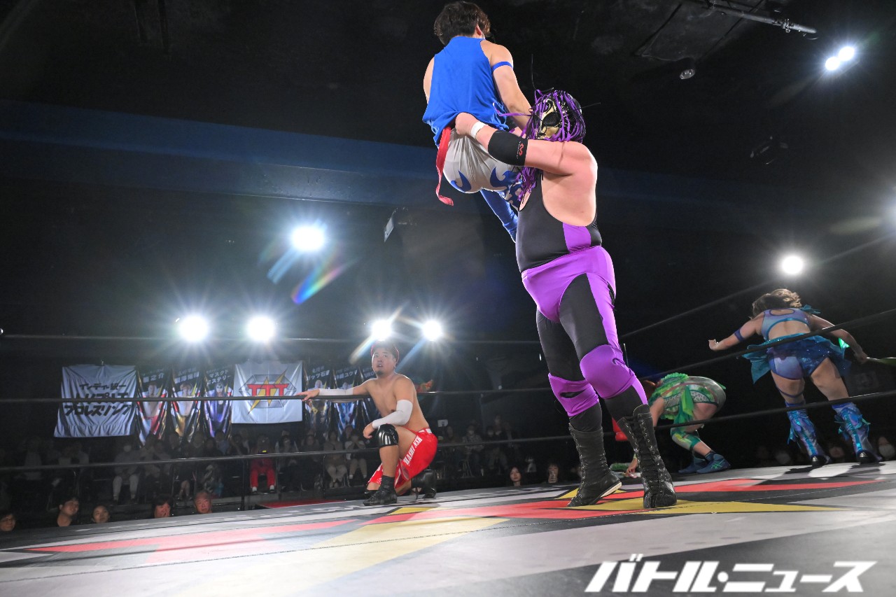 綾斗が「なにされてんねん、これ……」と困惑する中、滝澤が振り払ってバイシクル・キック。ロープに飛ぶが、攻撃をかわされてエプロン上で揉み合っていた秀旺&藤田に激突。ふらついたところを綾斗が変形サムソンクラッチで捕らえて3カウントを奪った。