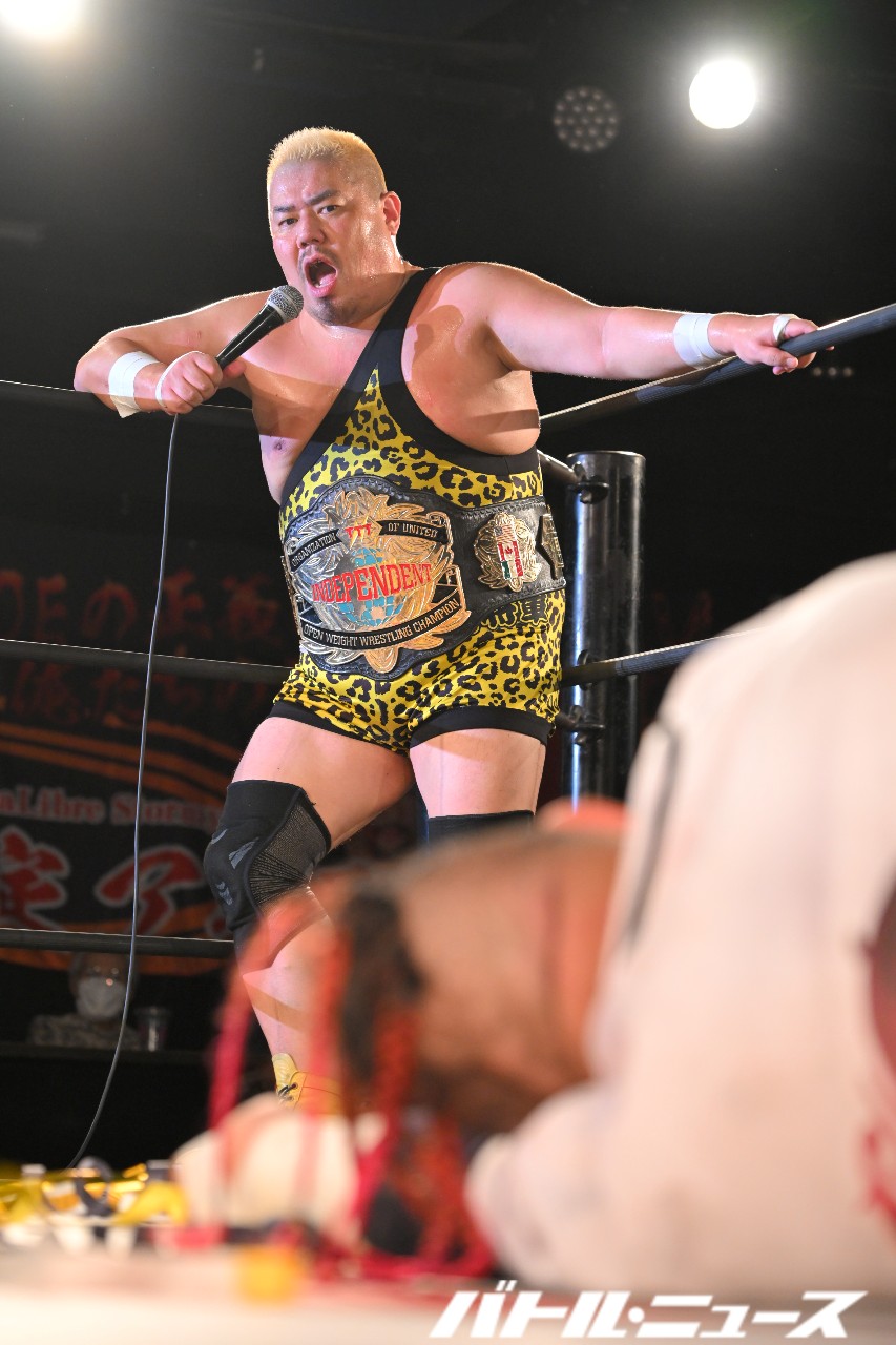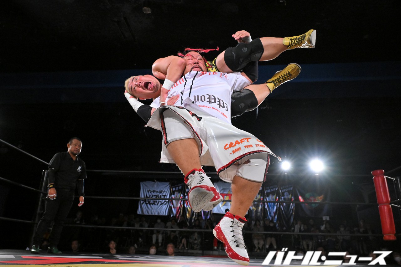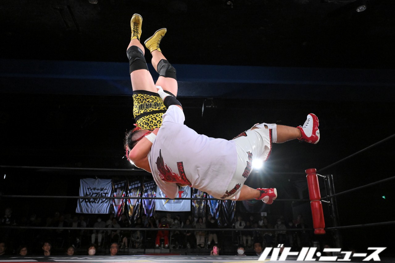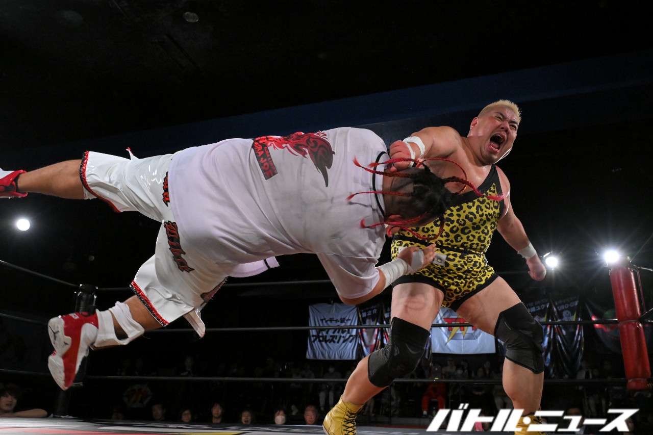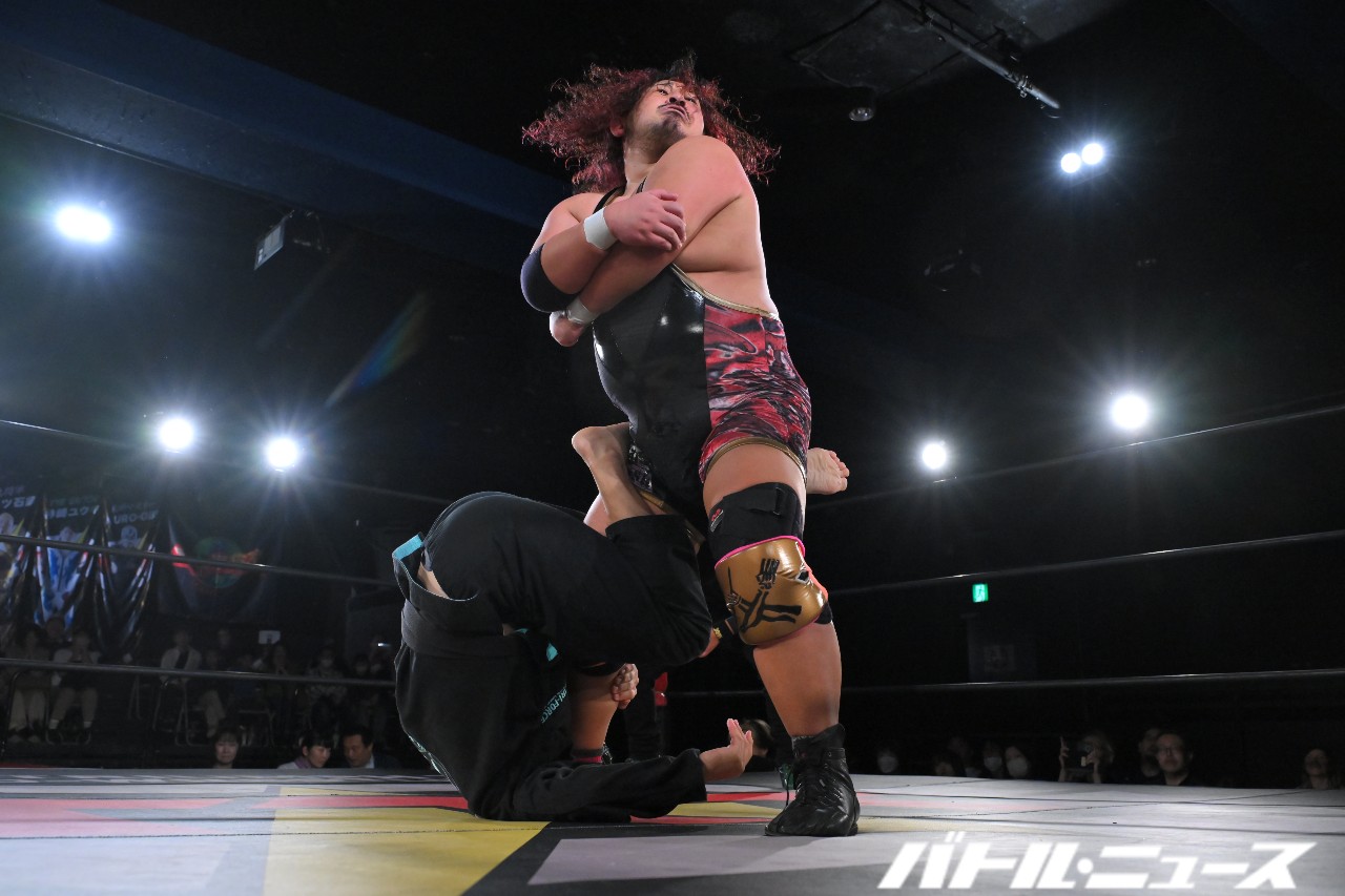KURO-OBIはスタンド式の胴絞めフロントネックロックで絞め落としにかかるが、後藤がぶっこ抜き、ジャンピング垂直落下式ブレーンバスターで頭から突き刺して3カウントを奪った。