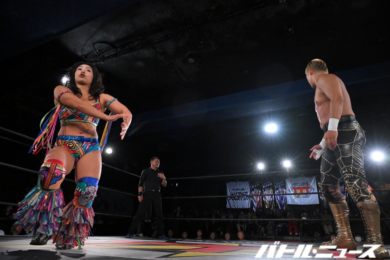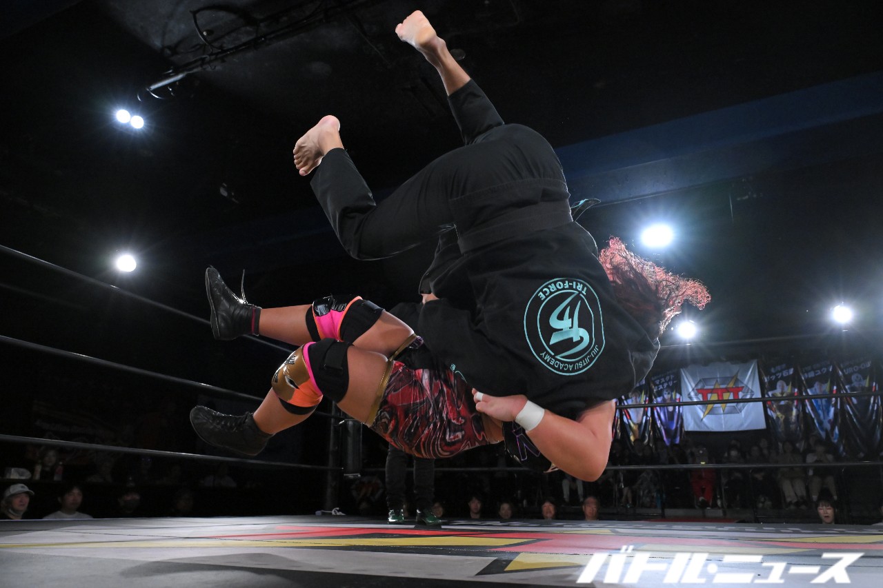 松澤さんは「ステファニー・バッケル!借りるね!」と叫んでクネクネとセクシーに踊ってからデヴィルズ・キス。さらに天を指さしてからラ・マヒストラルを狙うが、校長とは縁が薄かったのかモタモタしている間に真琴がひっくり返して抑え込む。