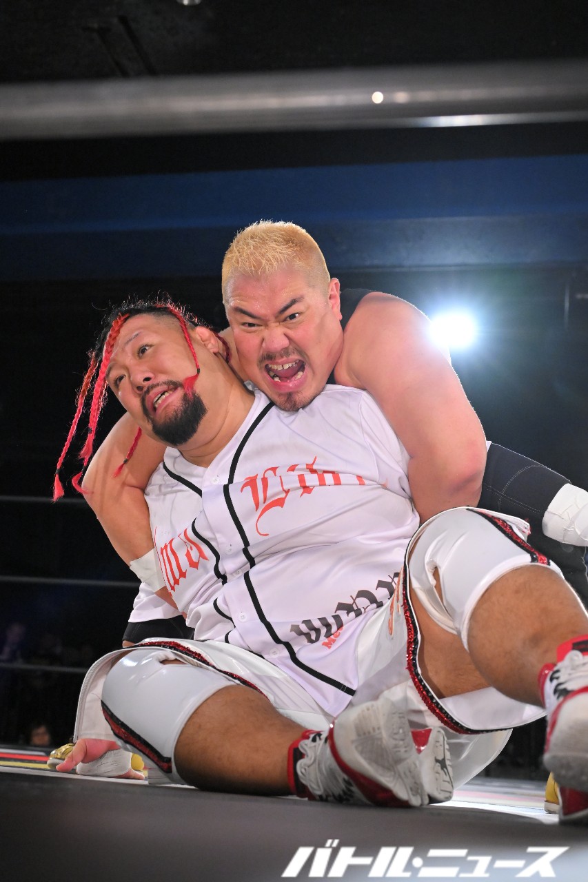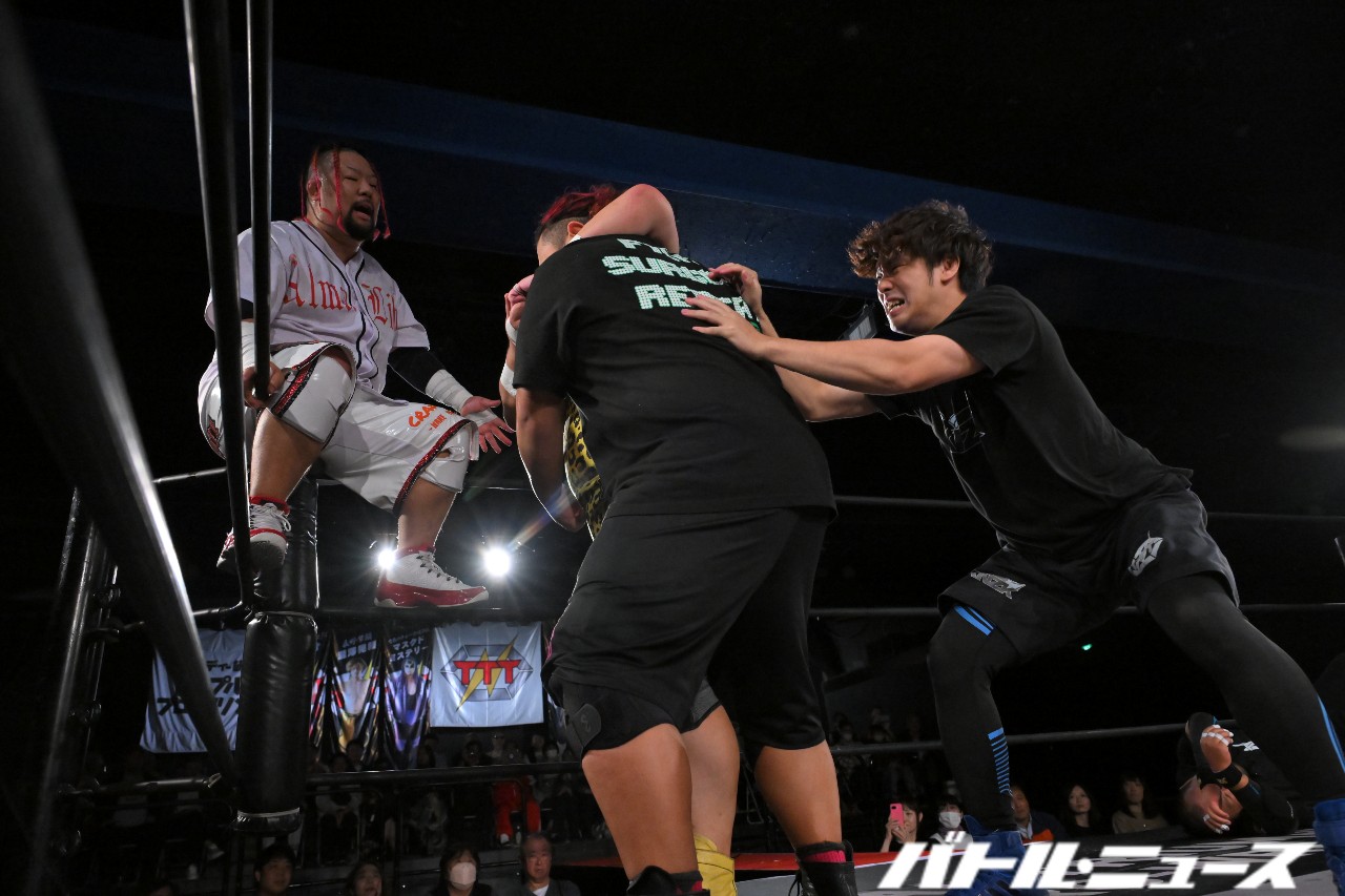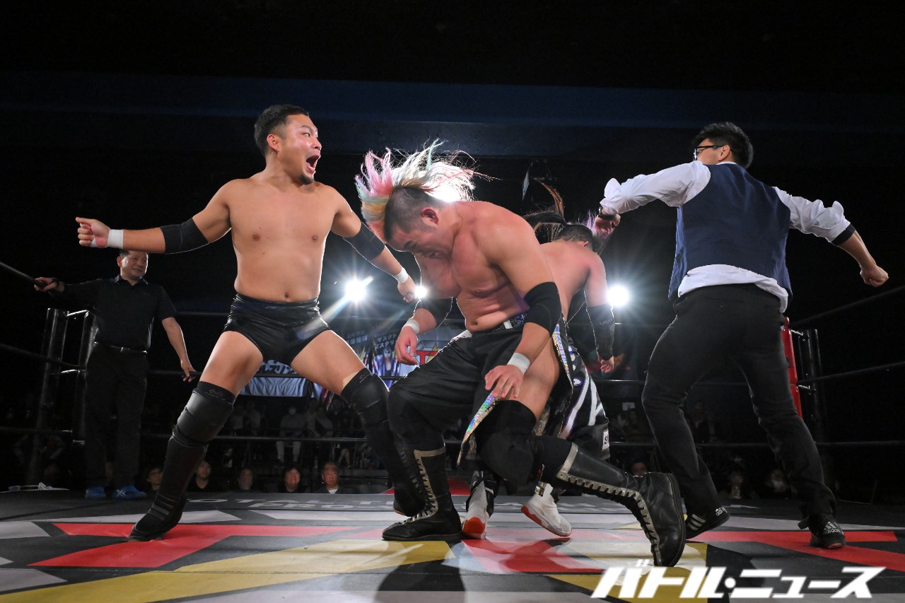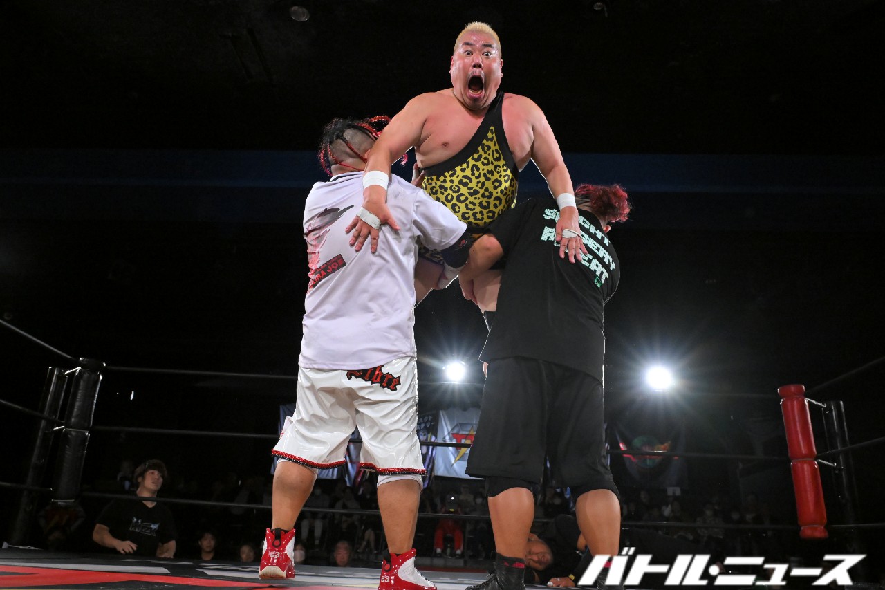 秀旺は藤田と綾斗にビッグブーツ&ナックルを連打。さらにダブルラリアットを放つも、綾斗&藤田がガード。藤田が2人での連携を狙うが、綾斗が「連携したことないやろ?!」と言い訳をして全く息が合わずにまごまご。その隙を突いた秀旺がフライング・ダブルラリアットでなぎ倒す。