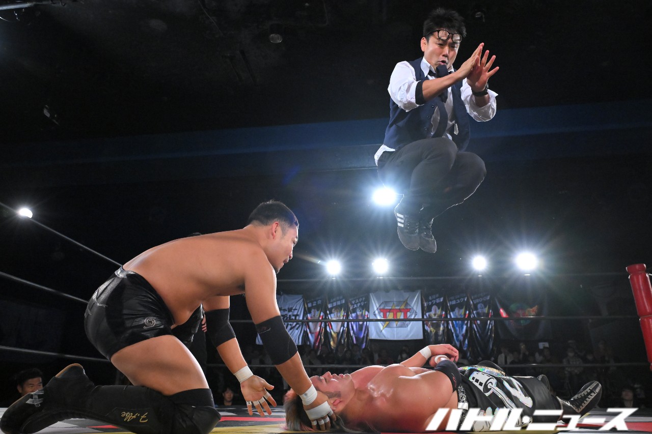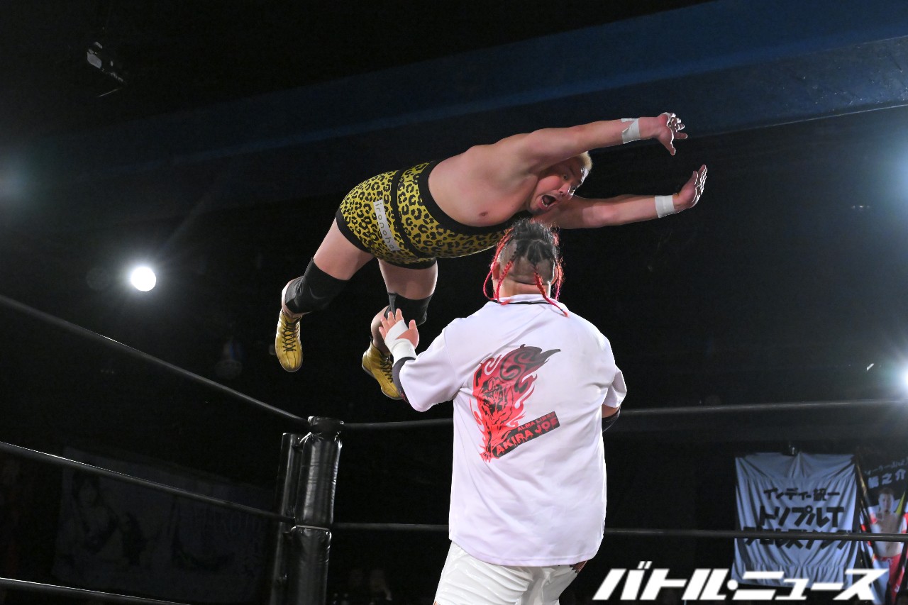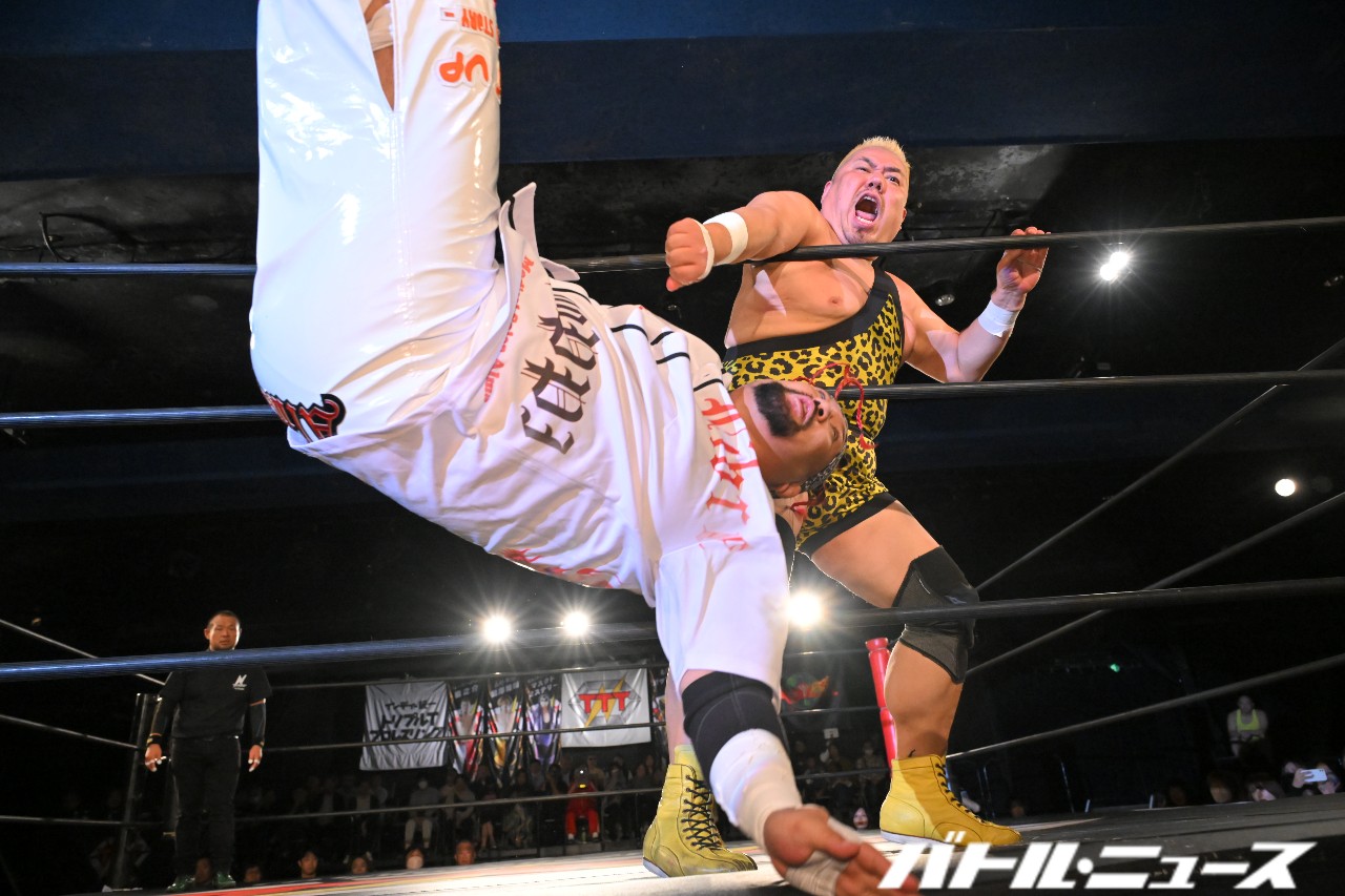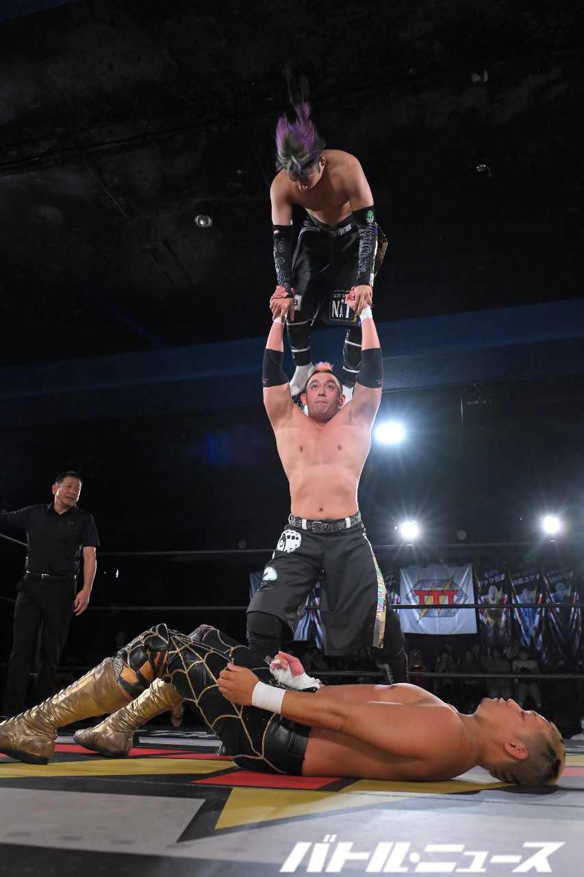 秀旺は藤田と綾斗にビッグブーツ&ナックルを連打。さらにダブルラリアットを放つも、綾斗&藤田がガード。藤田が2人での連携を狙うが、綾斗が「連携したことないやろ?!」と言い訳をして全く息が合わずにまごまご。その隙を突いた秀旺がフライング・ダブルラリアットでなぎ倒す。