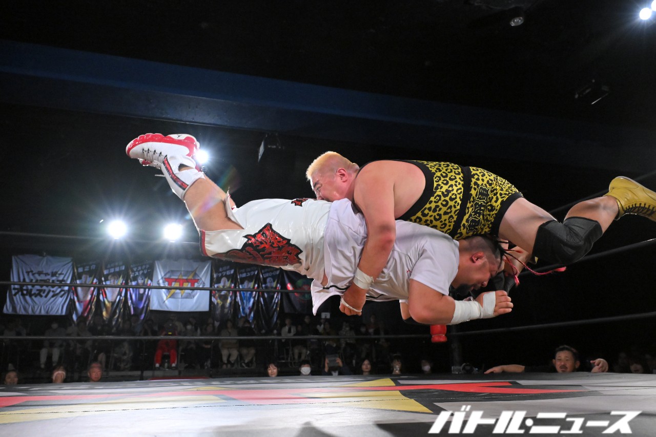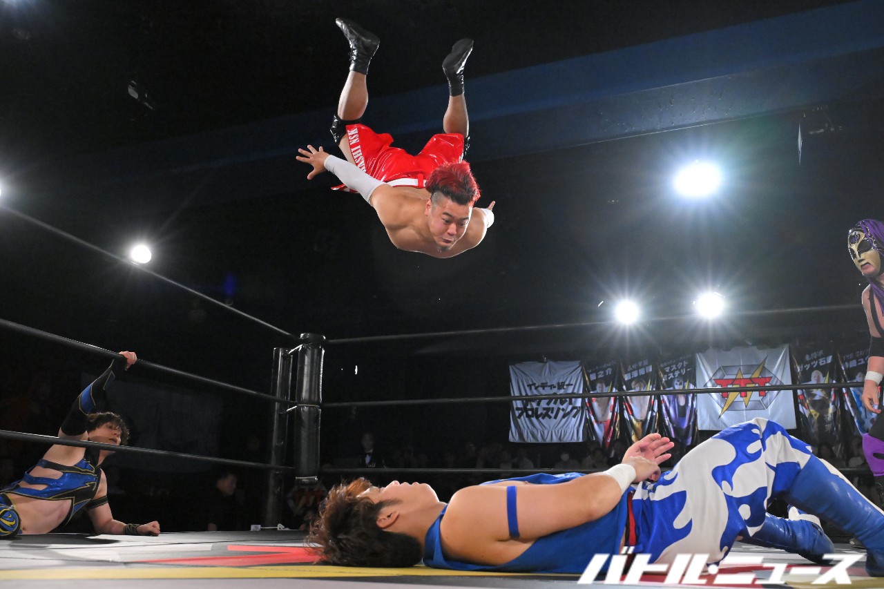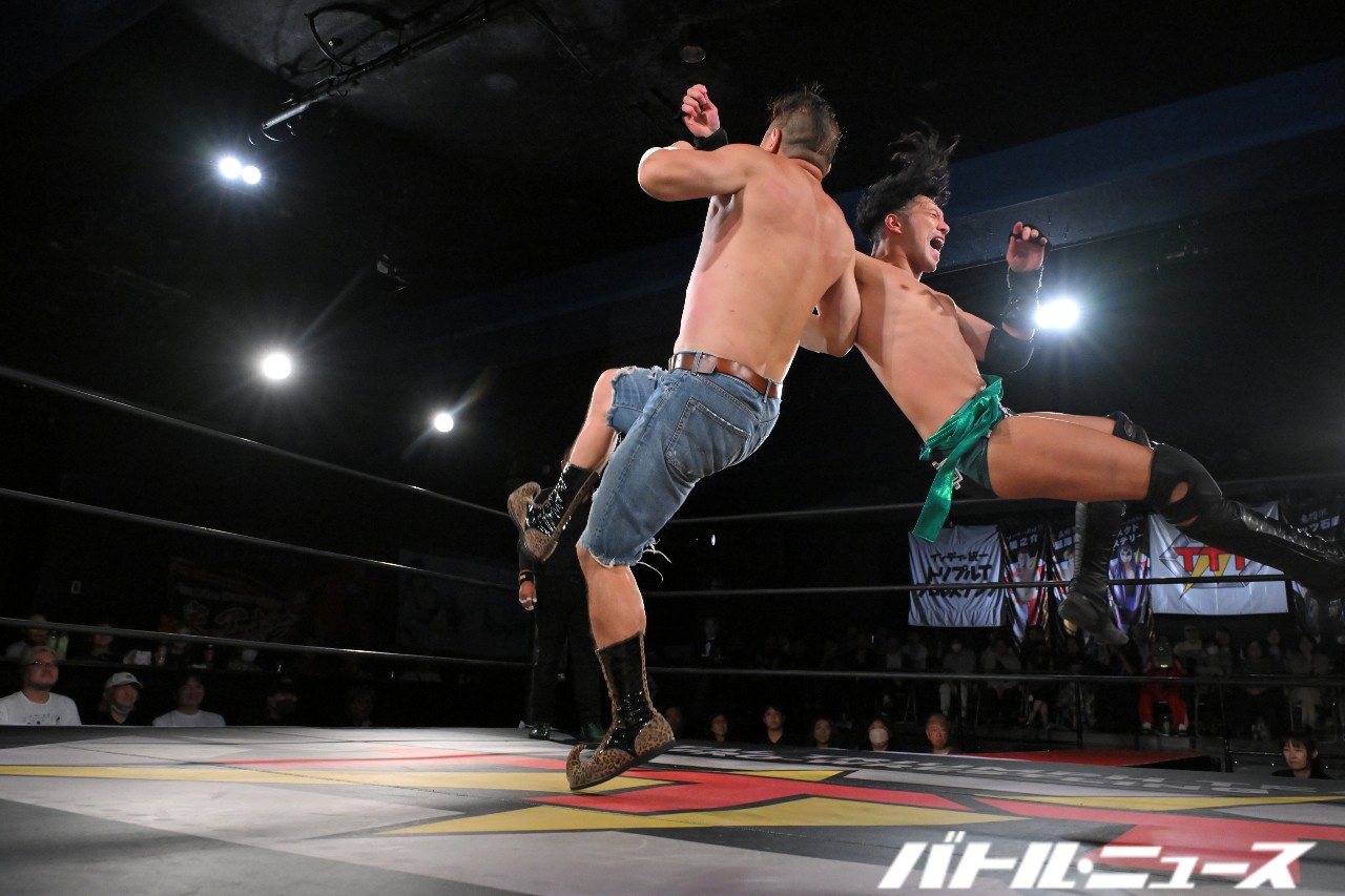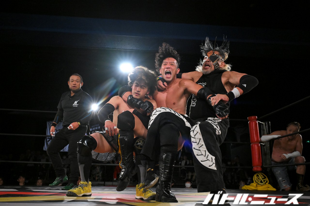 秀旺は藤田と綾斗にビッグブーツ&ナックルを連打。さらにダブルラリアットを放つも、綾斗&藤田がガード。藤田が2人での連携を狙うが、綾斗が「連携したことないやろ?!」と言い訳をして全く息が合わずにまごまご。その隙を突いた秀旺がフライング・ダブルラリアットでなぎ倒す。