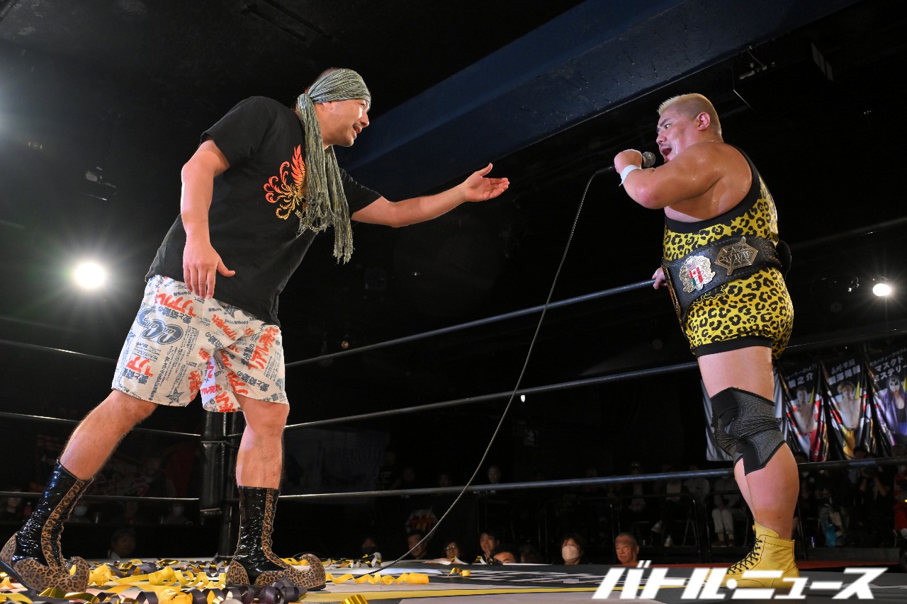 秀旺「どーも改めまして、ゴキブリ商会の藤原秀旺でございます。……あれっ?ベルト獲りました?次回11月3日ということで。11月3日はなんの日か知ってますか、皆さん。(※観衆の1人が「秀旺の誕生日!」と回答)おっ。そう!藤原秀旺の49回目のバースデーということで。11月3日はアートコートでやるようです。もちろんこの記念日にこのベルトを獲るために、私が挑戦者ということで決めさせていただきたいと思いますので、よろしくお願いします。どうでしょうか」