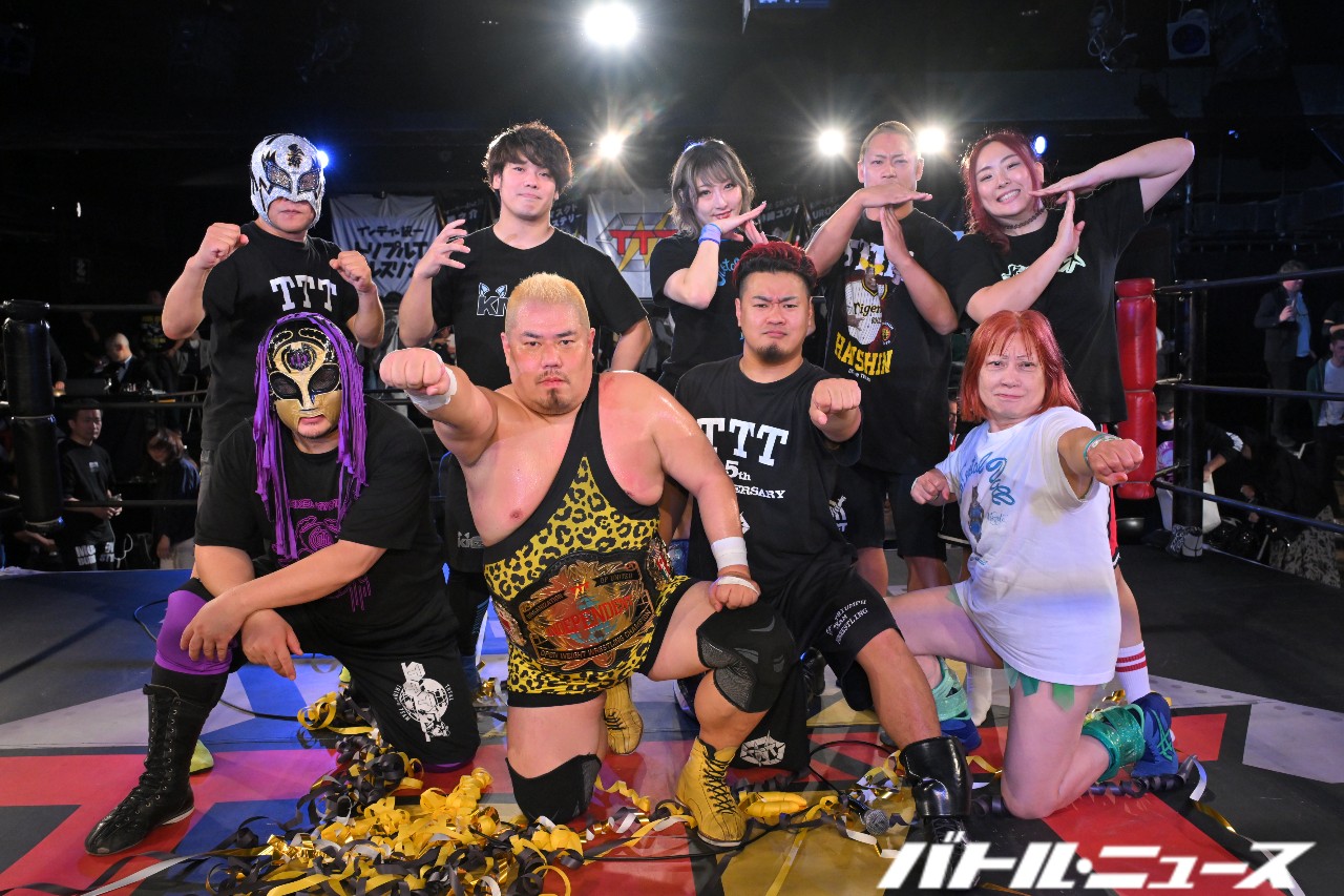 ガッツ「会長、いいですか、11月3日やって。(※会長がOKを出す)ありがとうございます。なんか締めづらい空気になっちゃったなあコノヤロー。皆さん本日は新宿FACEにご来場いただきましてありがとうございます!俺がチャンピオンになったからには誰の挑戦でも受けたいと思いますので皆さん応援の程よろしくお願いします!そして!年明け1月9日には2度目の後楽園ホール大会があります。金曜日です。3連休の初日です。ちょっと正月明けでみんなお金使っちゃっておサイフの中が厳しいと思いますが、皆さんどうか1月9日も我々TTTの試合を見に来ていただけたら幸いです。よろしくお願いします!今日は正規軍が勝ちましたので、TTTにはアントニオ猪木さんの『1!2!3!ダー!』みたいなのがあるんですよ。知ってますか皆さん。『シングル!ダブル!トリプルT!』ってのがあるんですよ。皆さん恥ずかしいと思いますけど、一番恥ずかしいのは俺なんで(笑)一緒にやっていただけたらと思います!今日出場された選手の皆さん上がれる方はリングに上ってください!赤信号みんなで渡れば怖くない的なね?(笑)こういう言い方は良くないか。皆さんお手数ですがご起立いただいて一緒にやっていただけますかね?行くぞ!オーッ!シングル!ダブル!トリプルT!ありがとうございましたッ!」